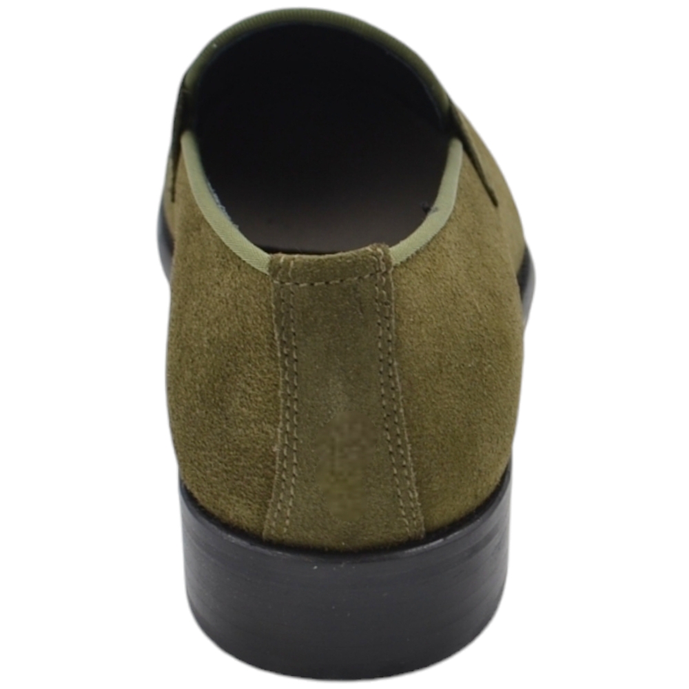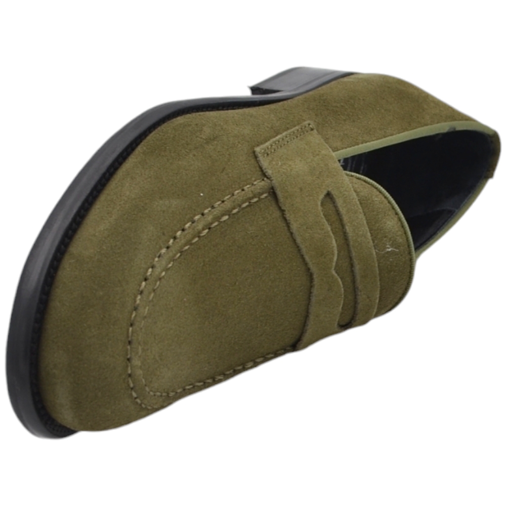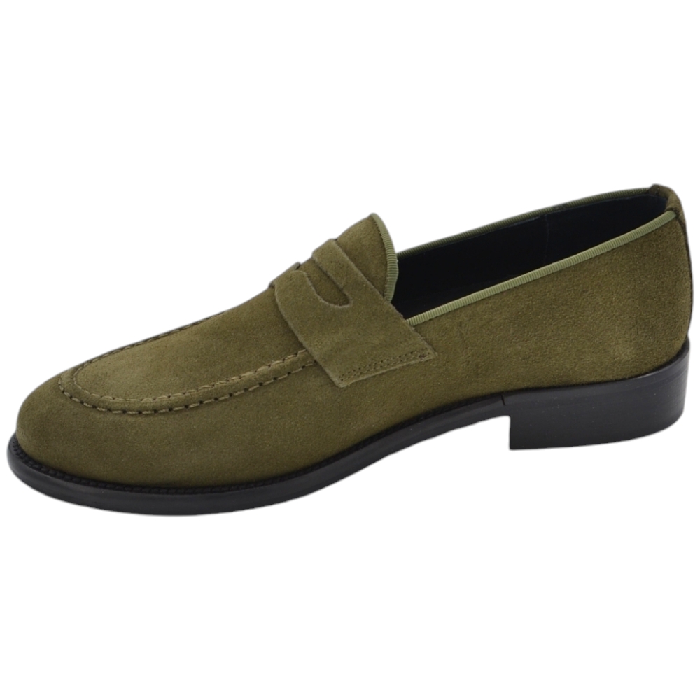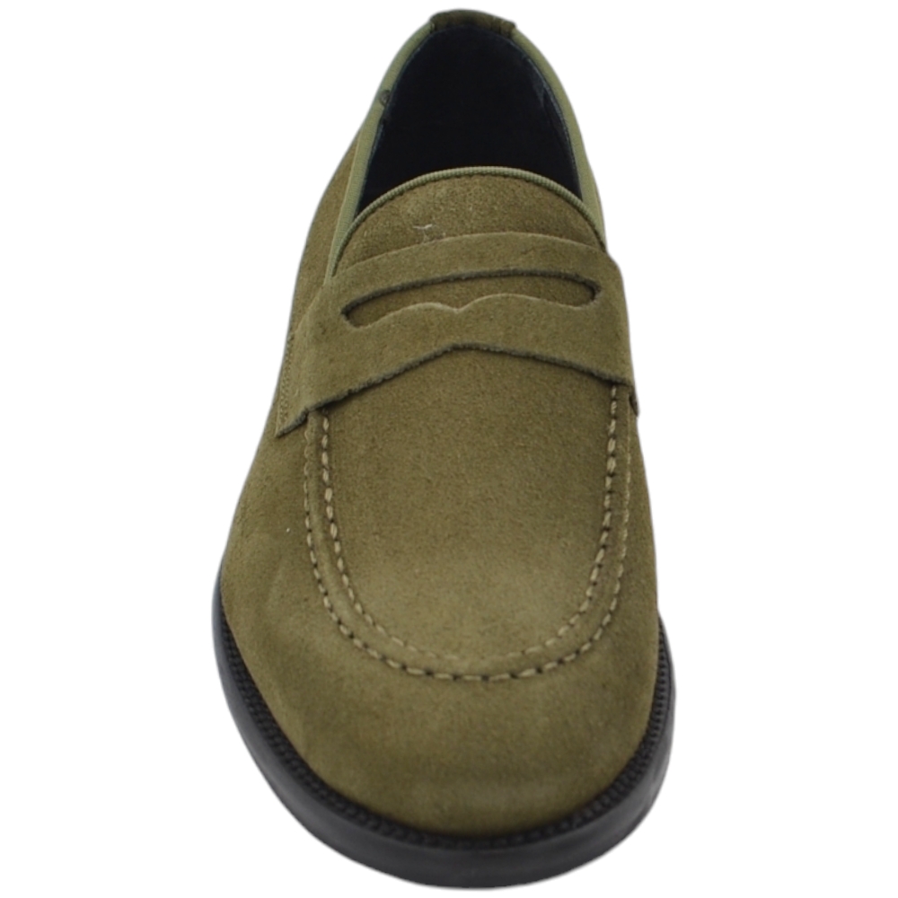 Mocassino uomo in vera pelle scamosciato verde con bendina fatte a mano con cuciture college in rilievo made in italy