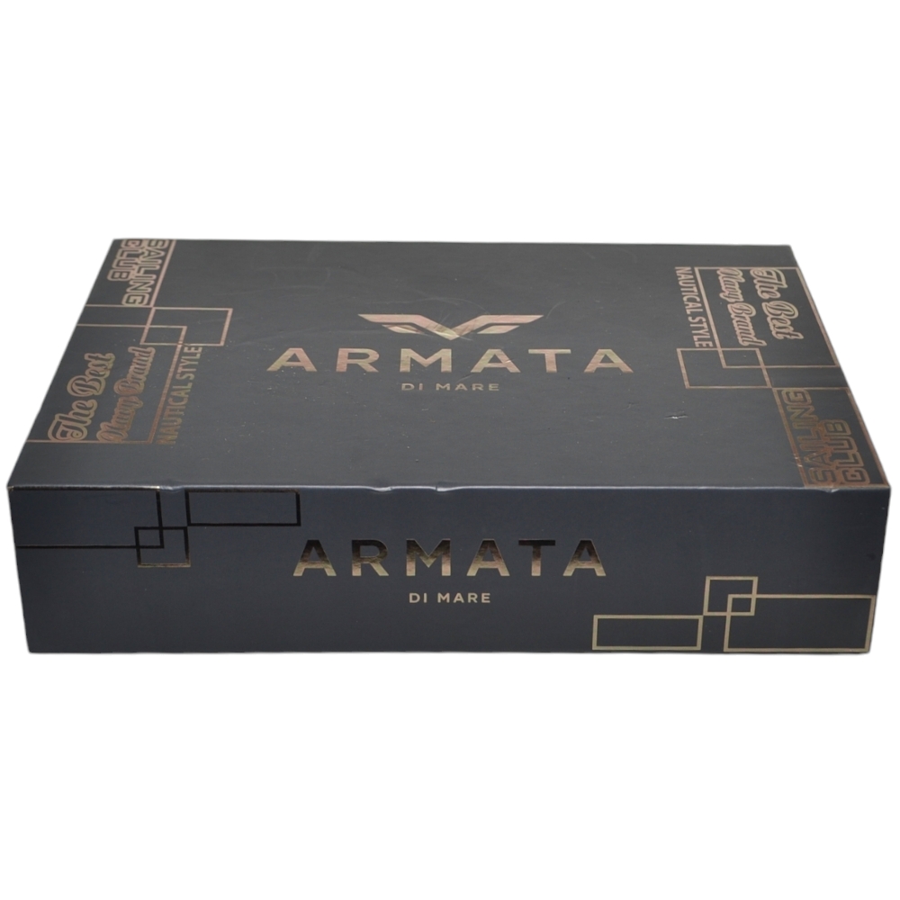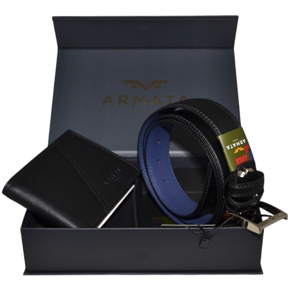 Set portafoglio e cintura armata di mare in vera pelle nera con scatola decorativa in legno con logo