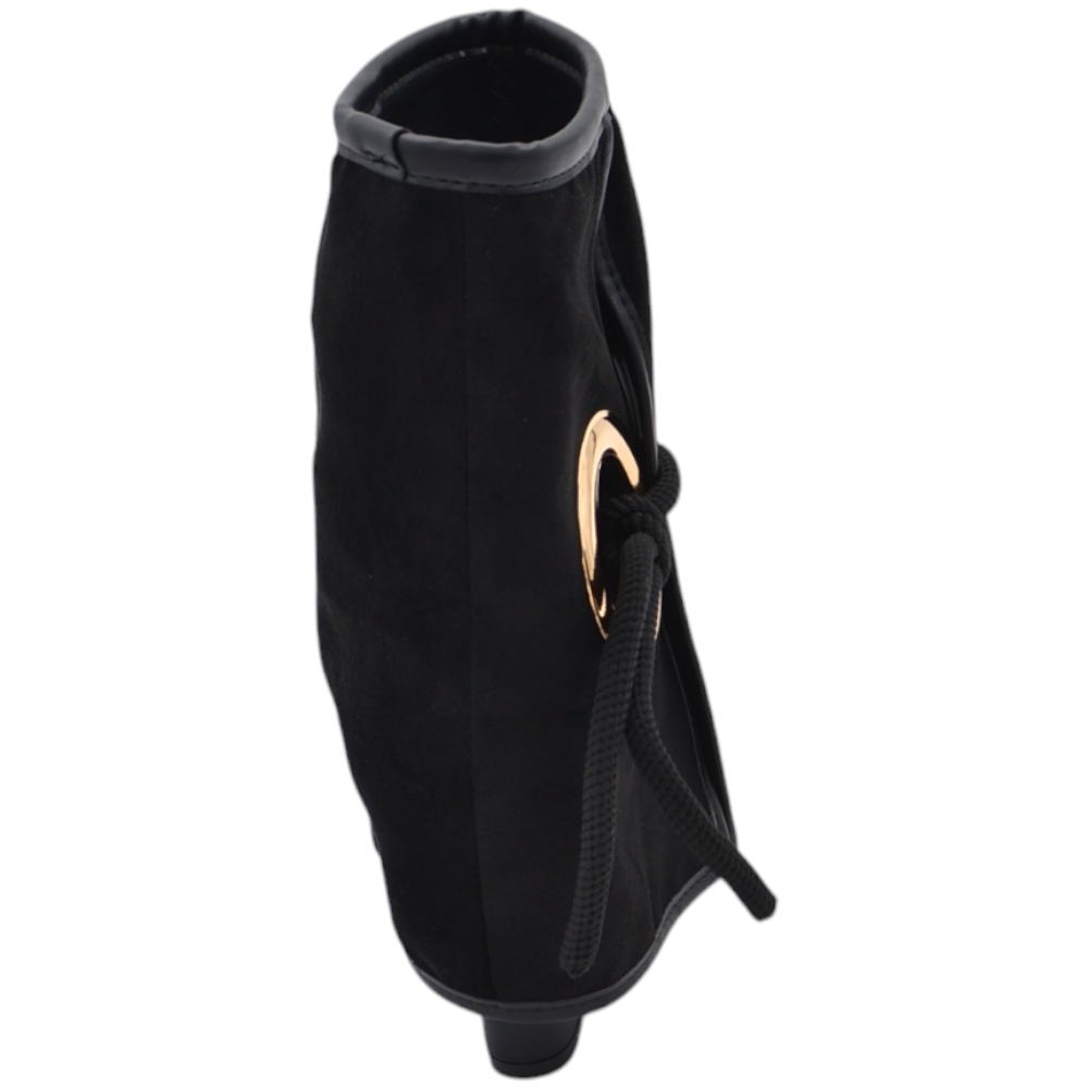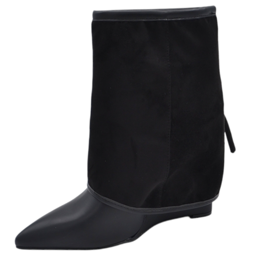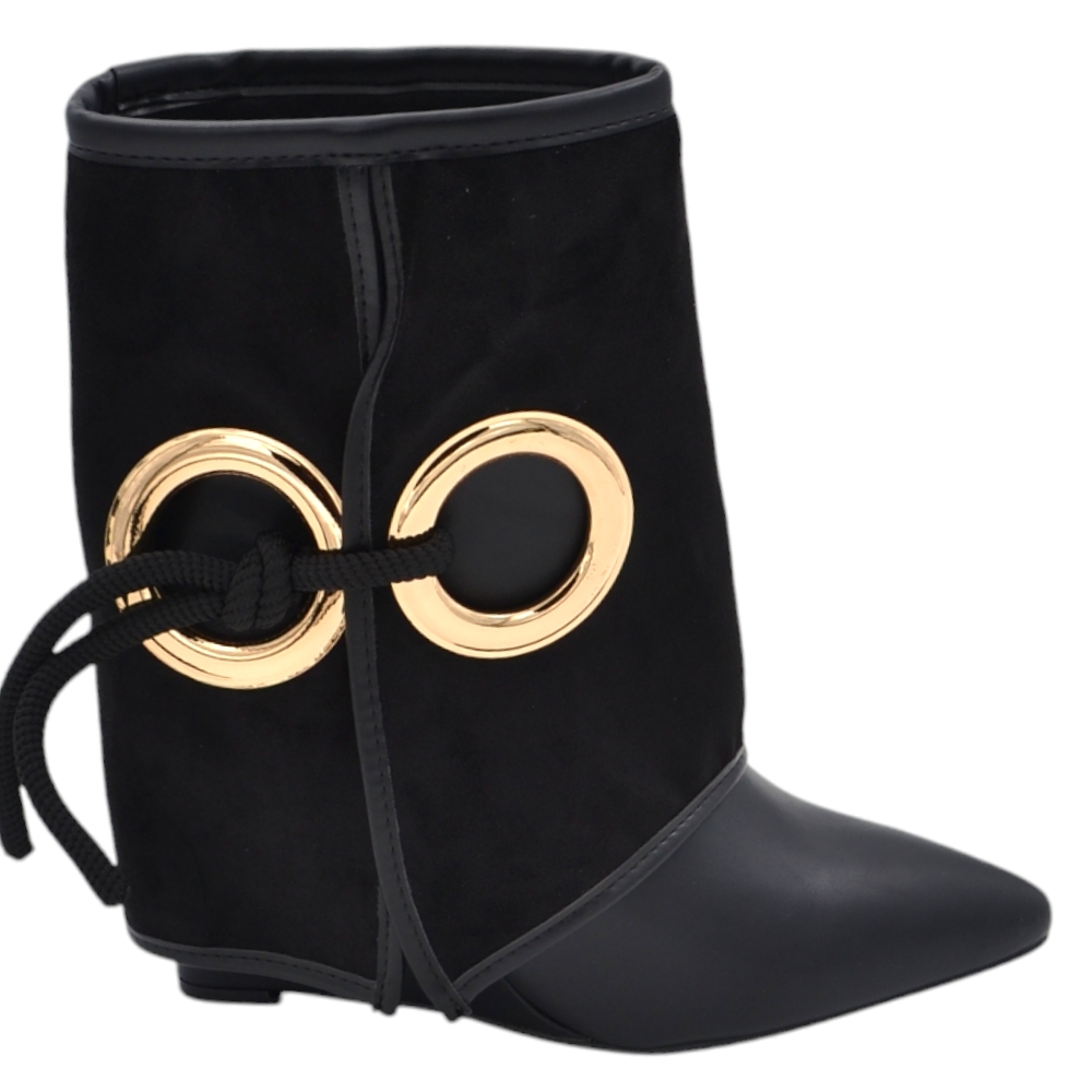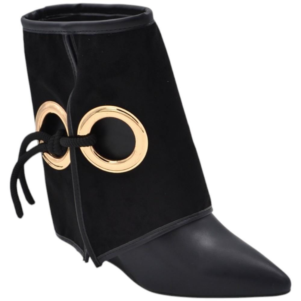 Stivaletti donna alti in camoscio nero applicazioni oro modello shark risvolto fino a terra zeppa 10 cm con zip