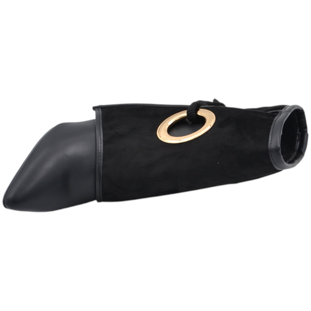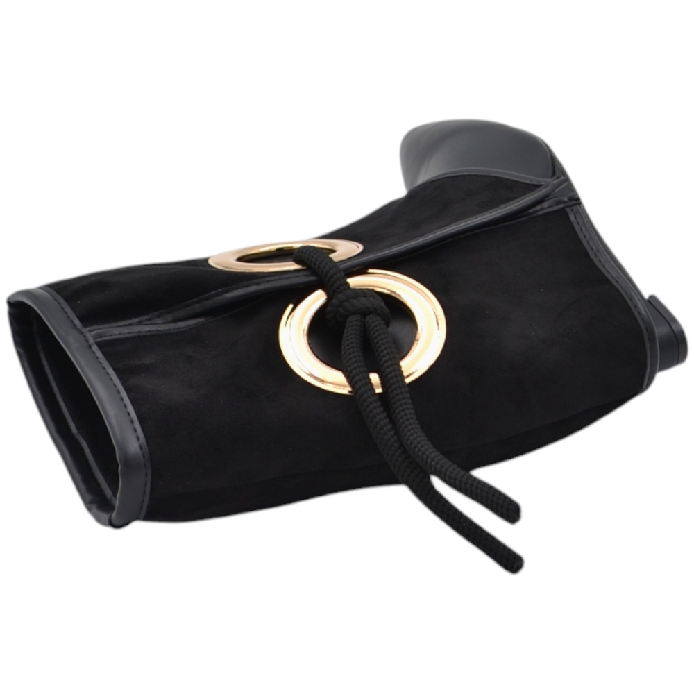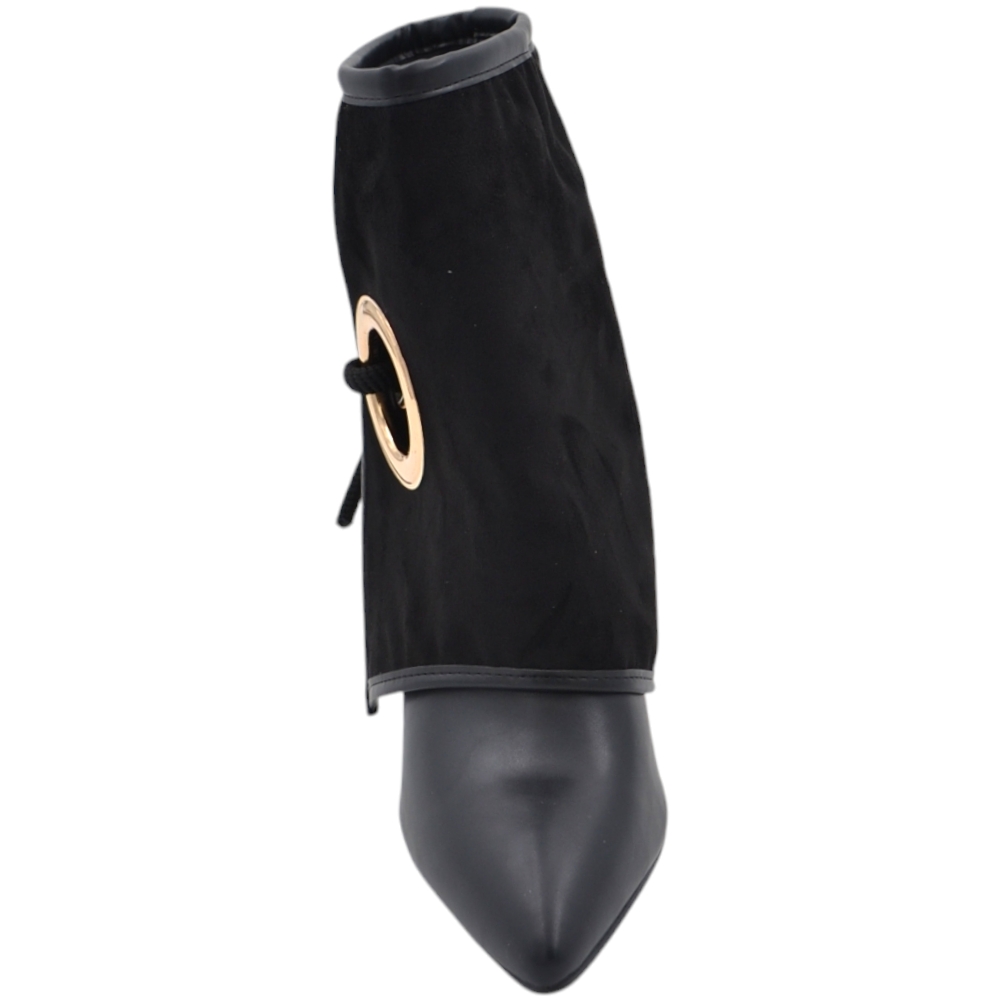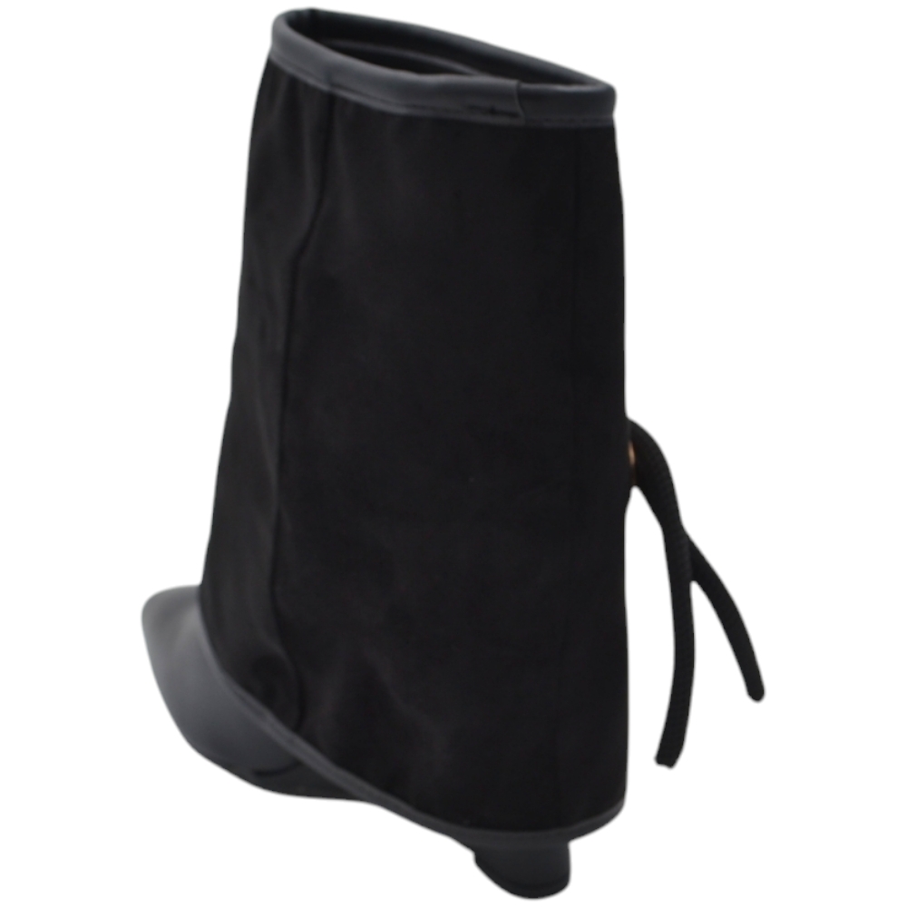 Stivaletti donna alti in camoscio nero applicazioni oro modello shark risvolto fino a terra zeppa 10 cm con zip