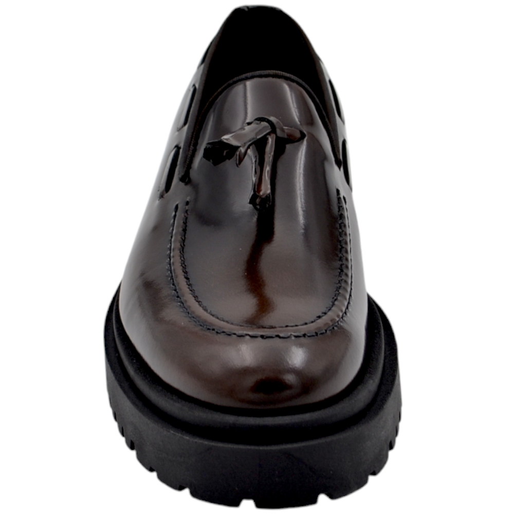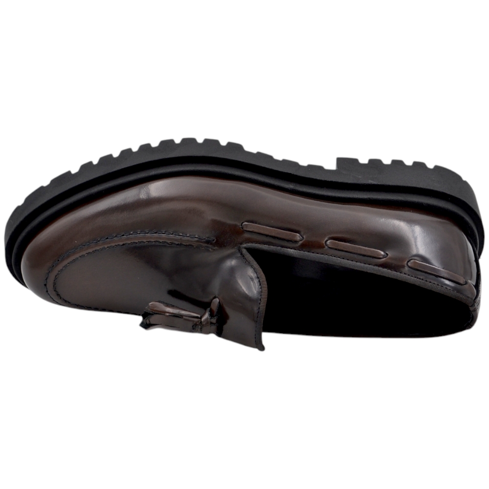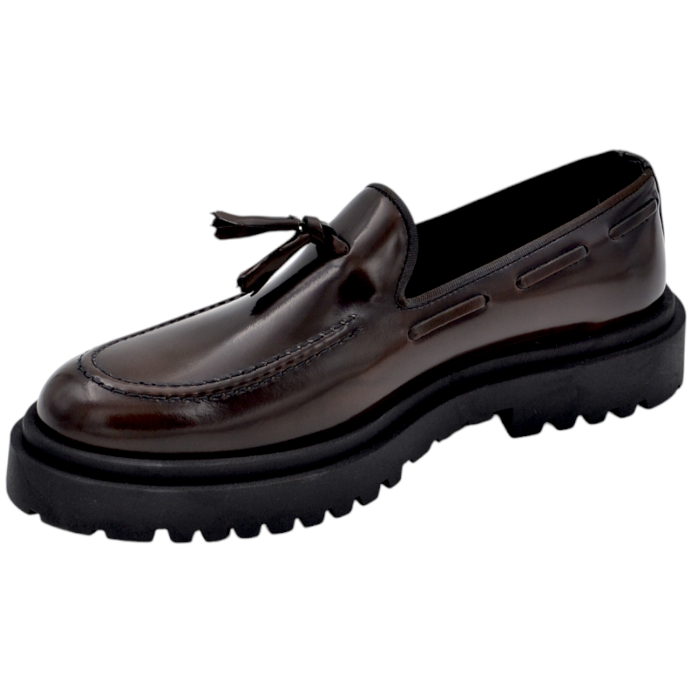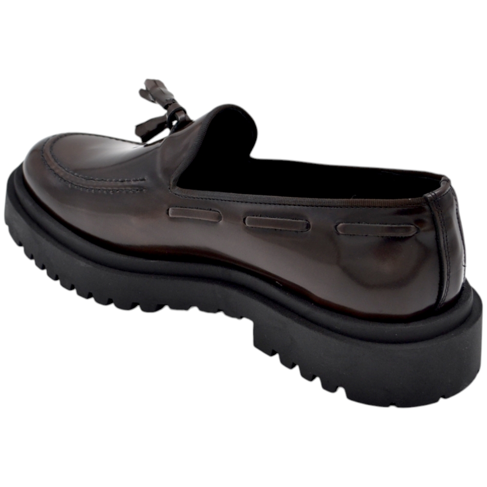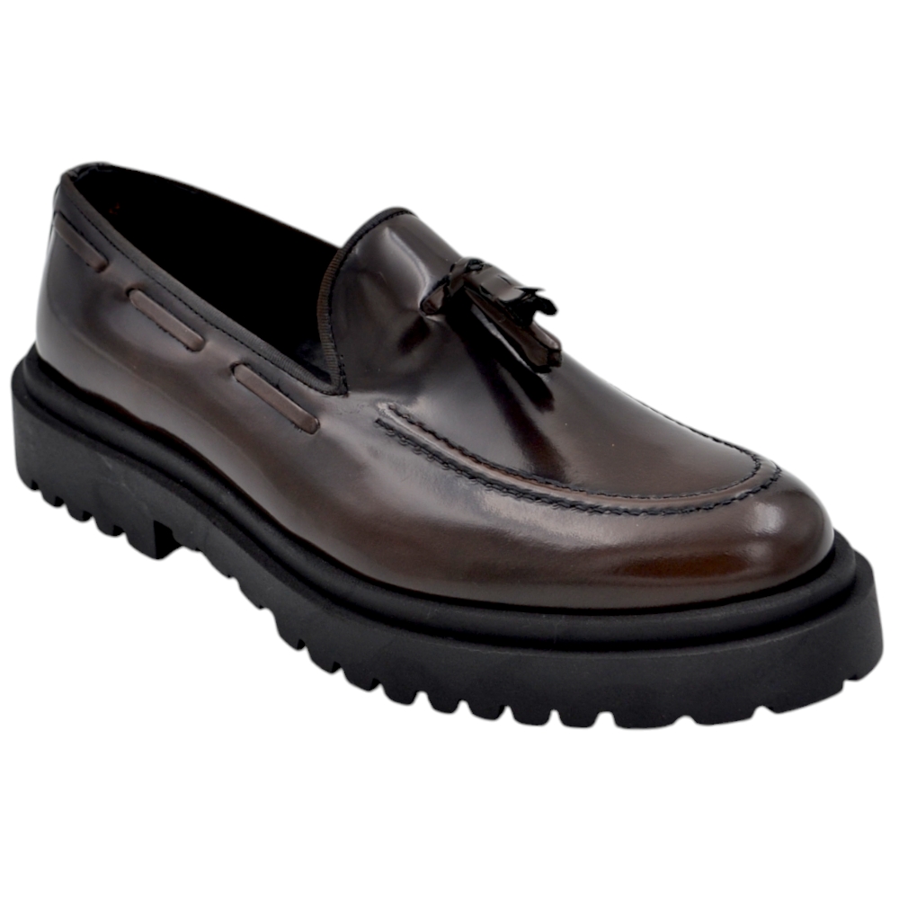 Scarpa mocassino uomo LS frangia vera pelle bottolata testa di moro cucita a mano fondo cuoio antiscivolo centrale .