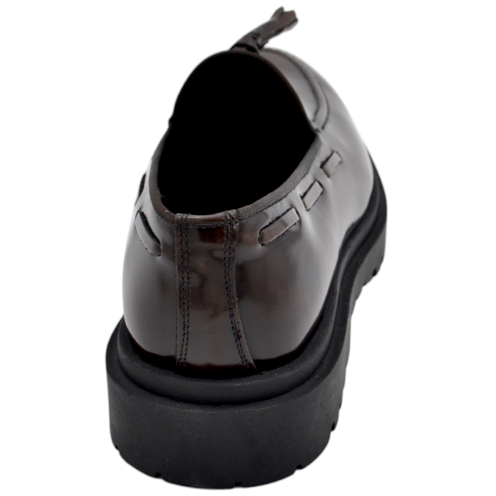 Scarpe uomo mocassino con bendina marrone spazzolato in vera pelle di nappa business fondo gomma roccia alto.