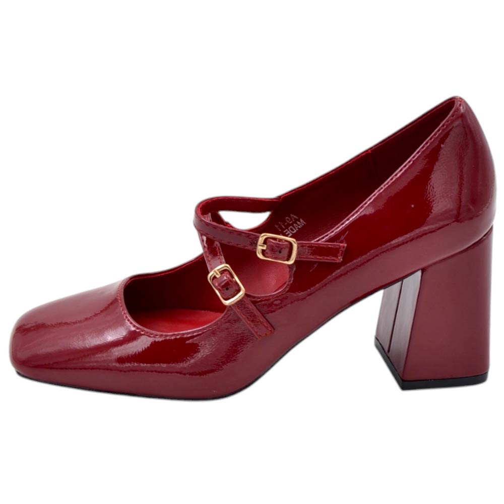 Scarpa decollete donna punta quadrata con tacco largo 8 cm fibbie oro e cinturini regolabili vernice bordeaux lucido