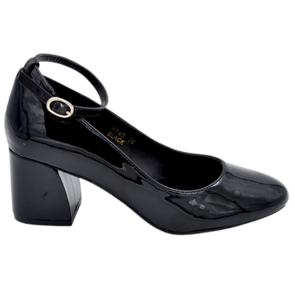 Scarpa decollete' donna nero lucido punta semiquadrata con tacco largo 6 cm cinturino regolabile alla caviglia
