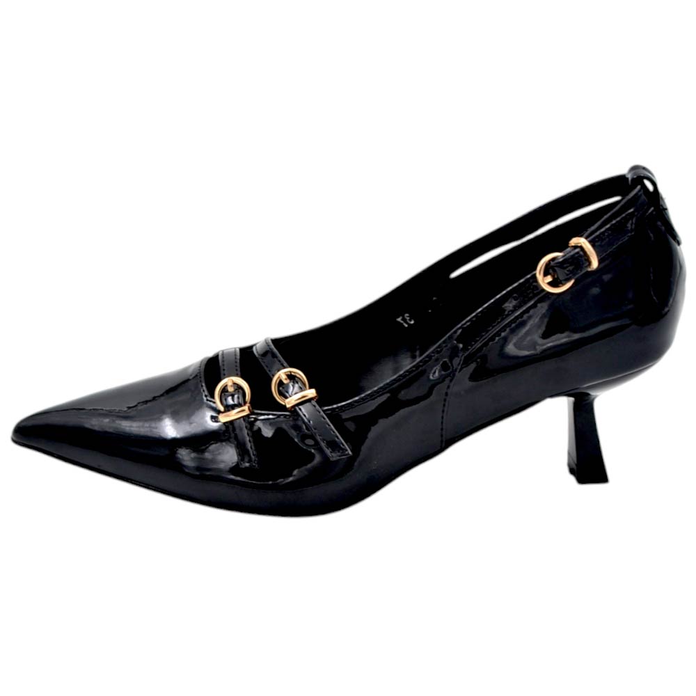 Decollete' donna in vernice lucida nero con tacco kitten 3 cm e cinturini incrociati sul dorso piede ganci oro