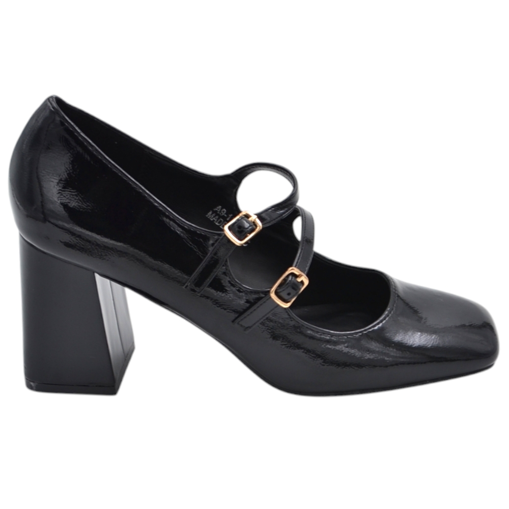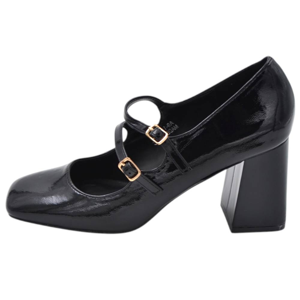 Scarpa decollete' donna punta quadrata con tacco largo 8 cm fibbie oro e cinturini regolabili vernice nero lucido