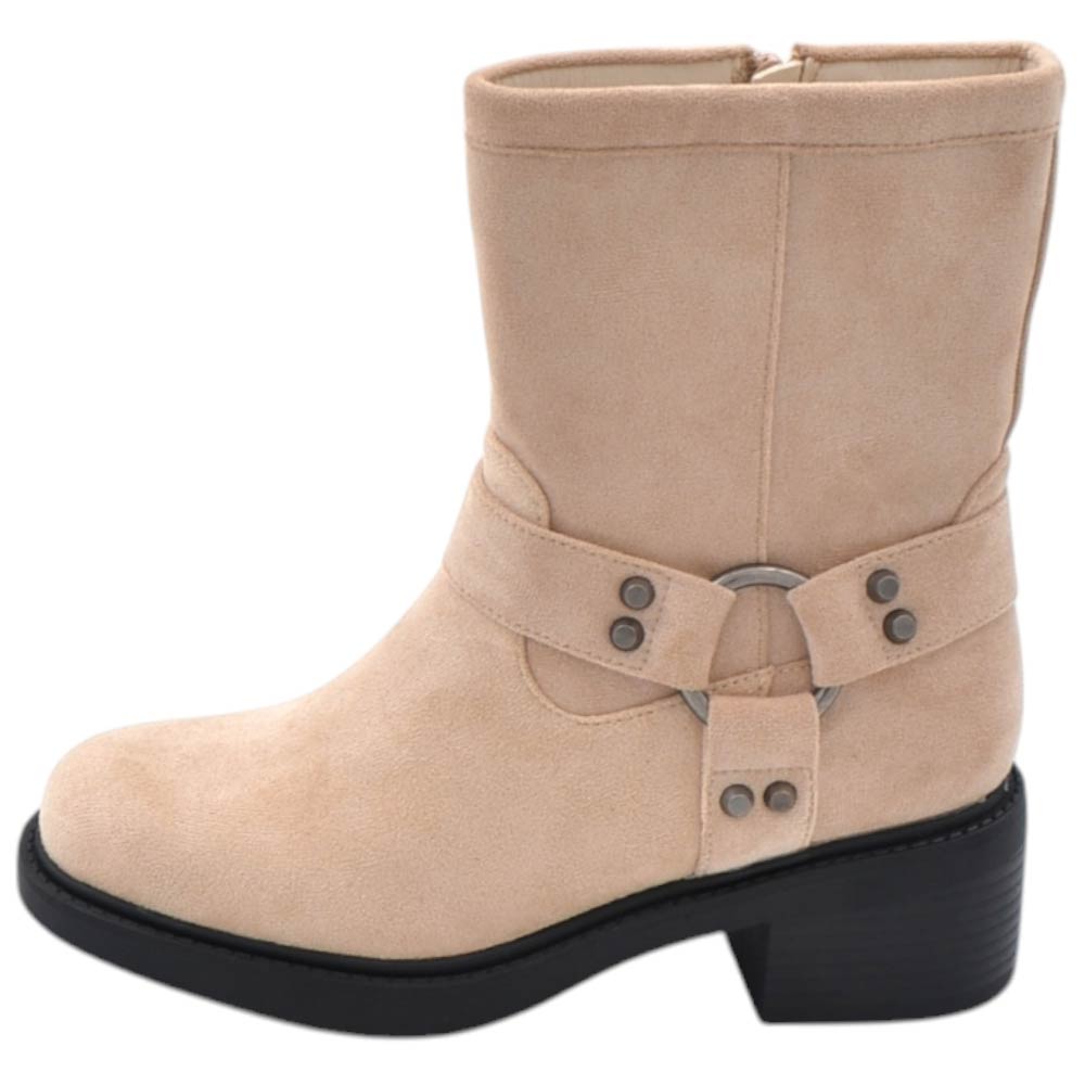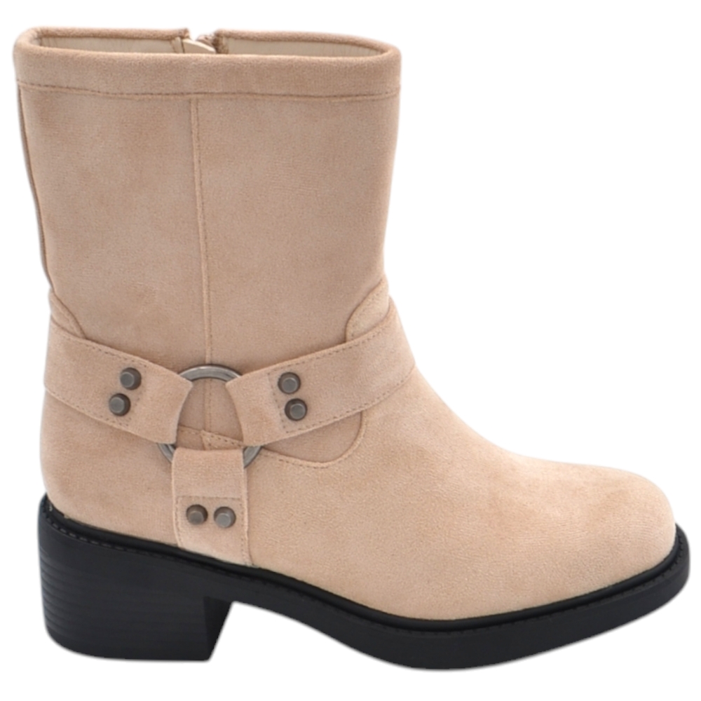 Stivaletto donna in nabuk scamosciato beige morbido con striscia cuoio gomma bassa antiscivolo moda al polpaccio biker.