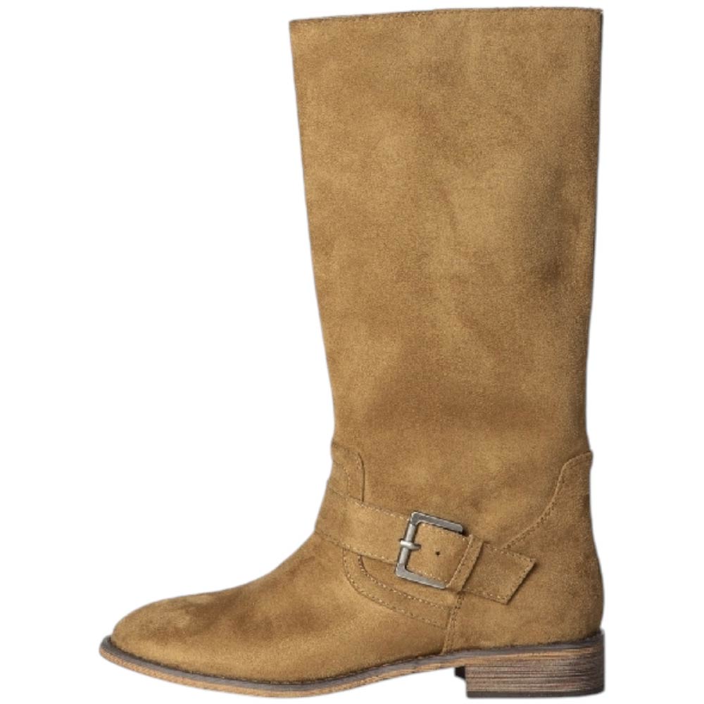 Stivali Corina biker in camoscio camel morbido liscio punta tonda fibbia argento tacco 2,5 cm