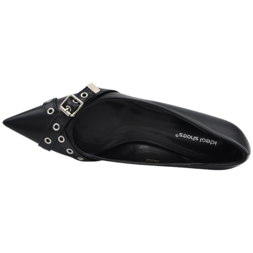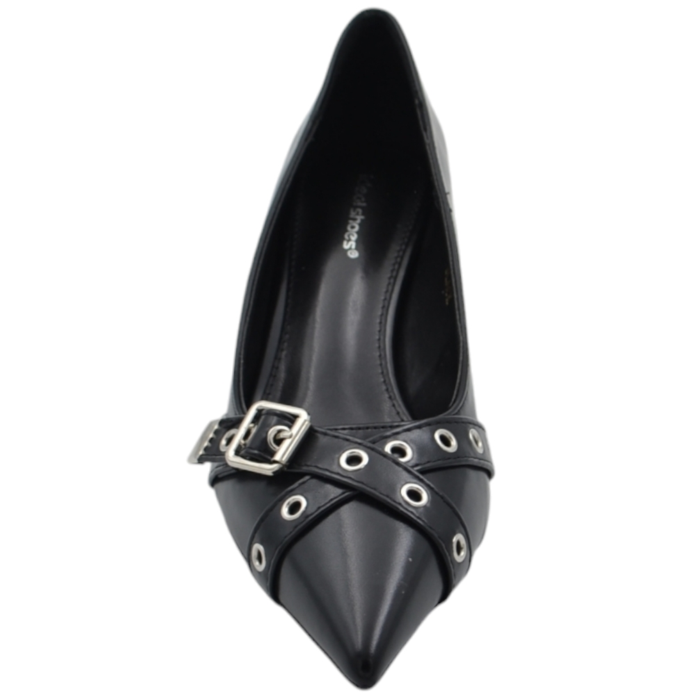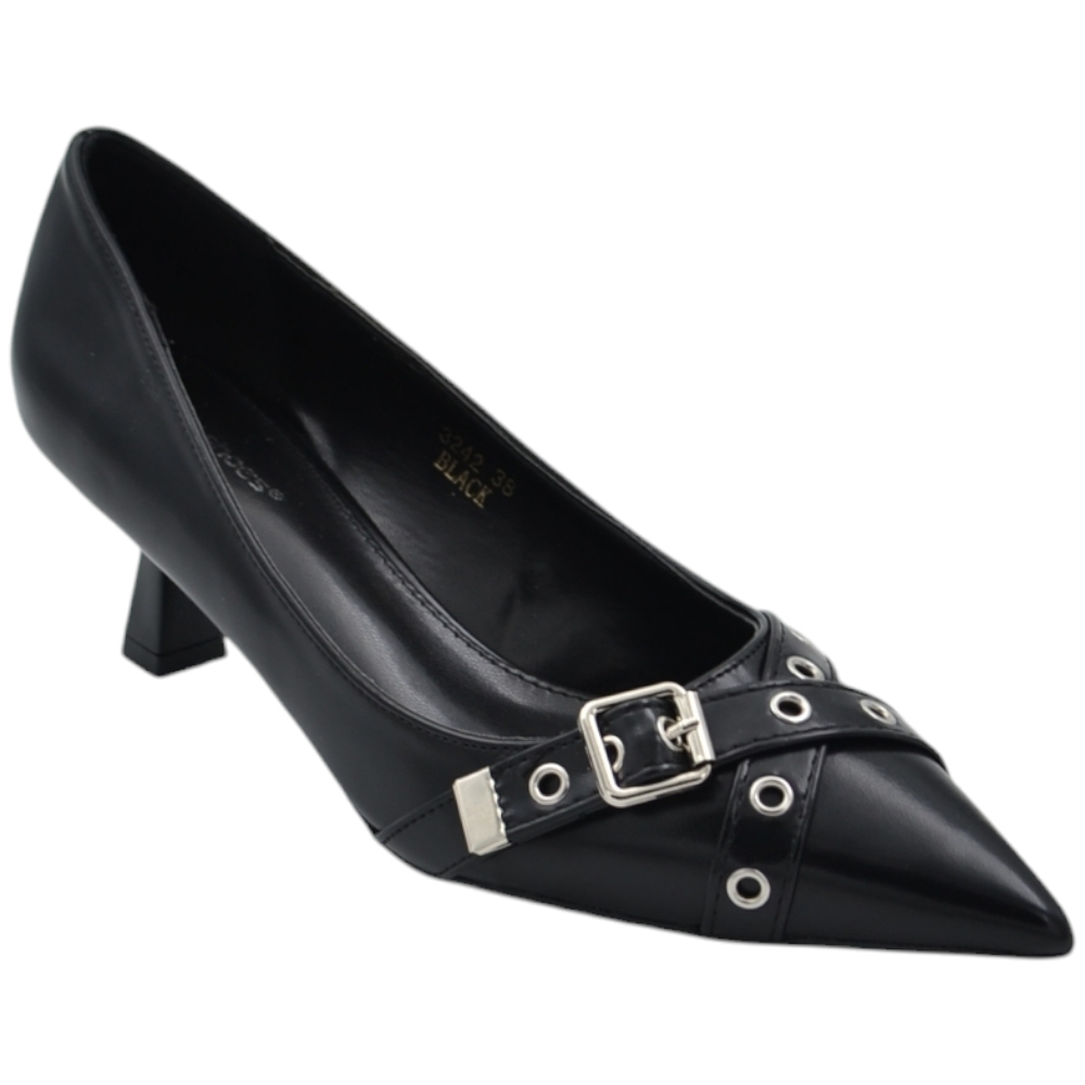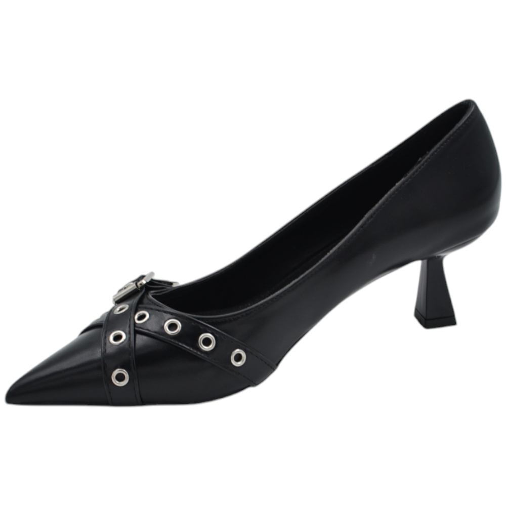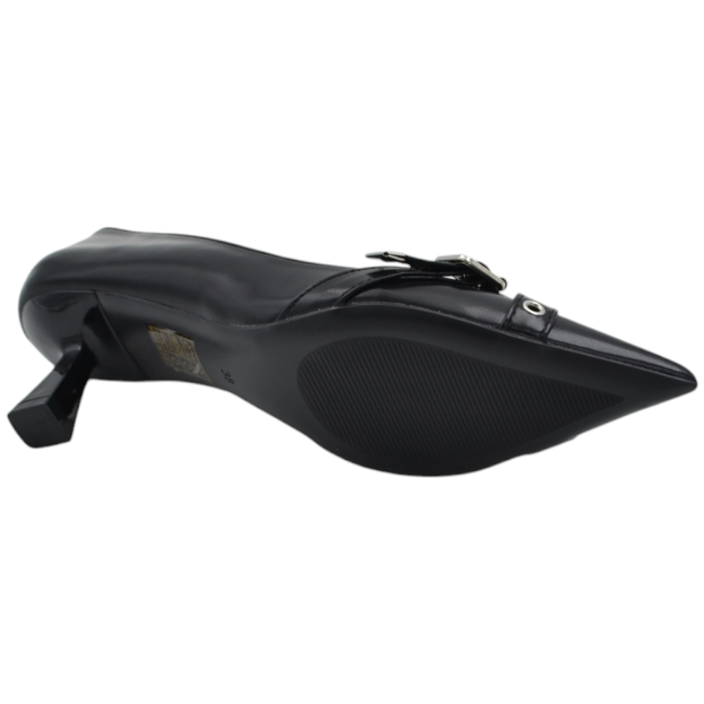 Decollete' donna in pelle matte nero con tacco clessidra 3 cm con cinturini e fibbie incrociati argento linea basic moda