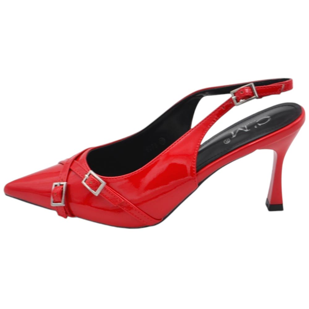 Decolette' donna in pelle lucida rossa punta tacco clessidra 8 cm cinturino regolabile tallone con fibbie e cinturini