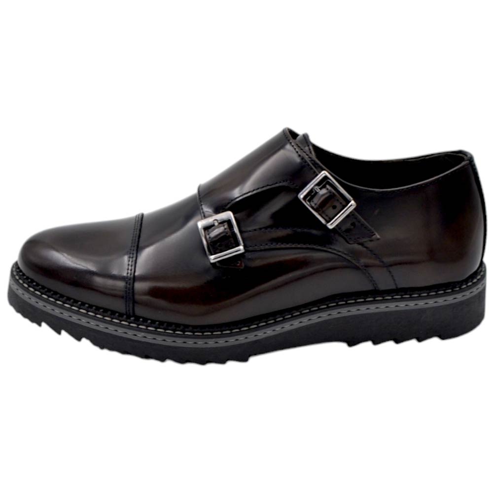 Scarpe uomo doppia fibbia in vera pelle abrasiva marrone suola alta zigrinata bicolore mezza punta chiusura fibbia