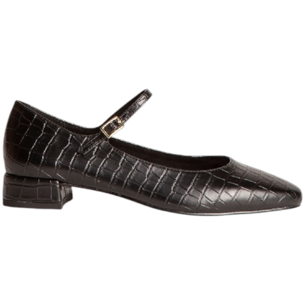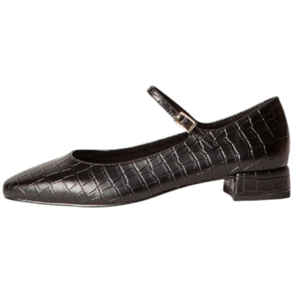 Ballerina tipo Mary Jane con tacco basso. Punta rotonda. Chiusura con fibbia sul lato.
