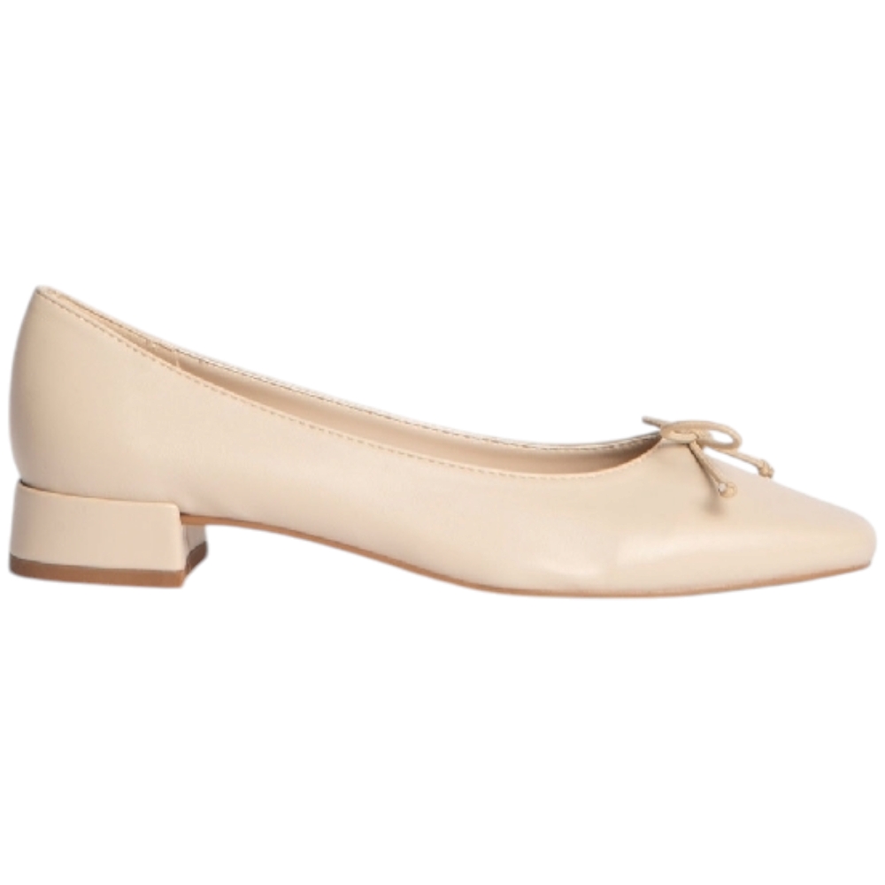 Ballerina con tacco basso e taglio effetto pelle. Dettaglio fiocco sul davanti e bordo profilato.