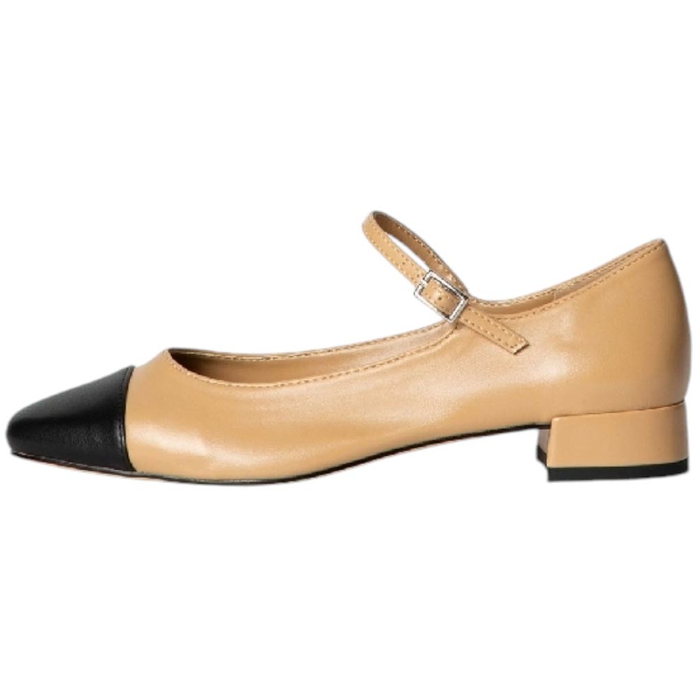 Ballerina Mary Jane bassa con tacco basso. Dettaglio sulla punta.