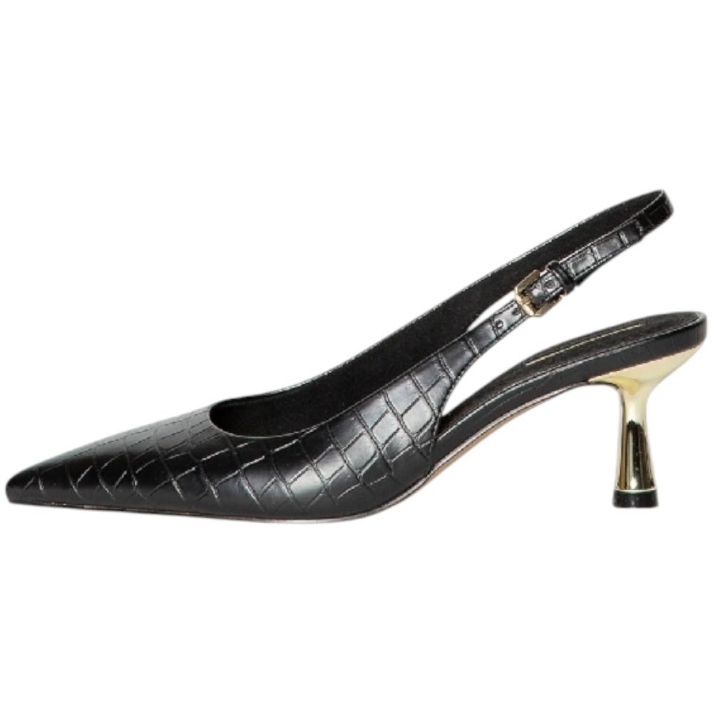 Tallone sul retro aperto. Finitura a punta. Taglio arrotondato. Cinturino posteriore con fibbia.