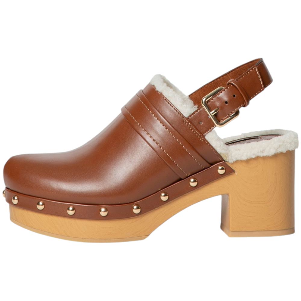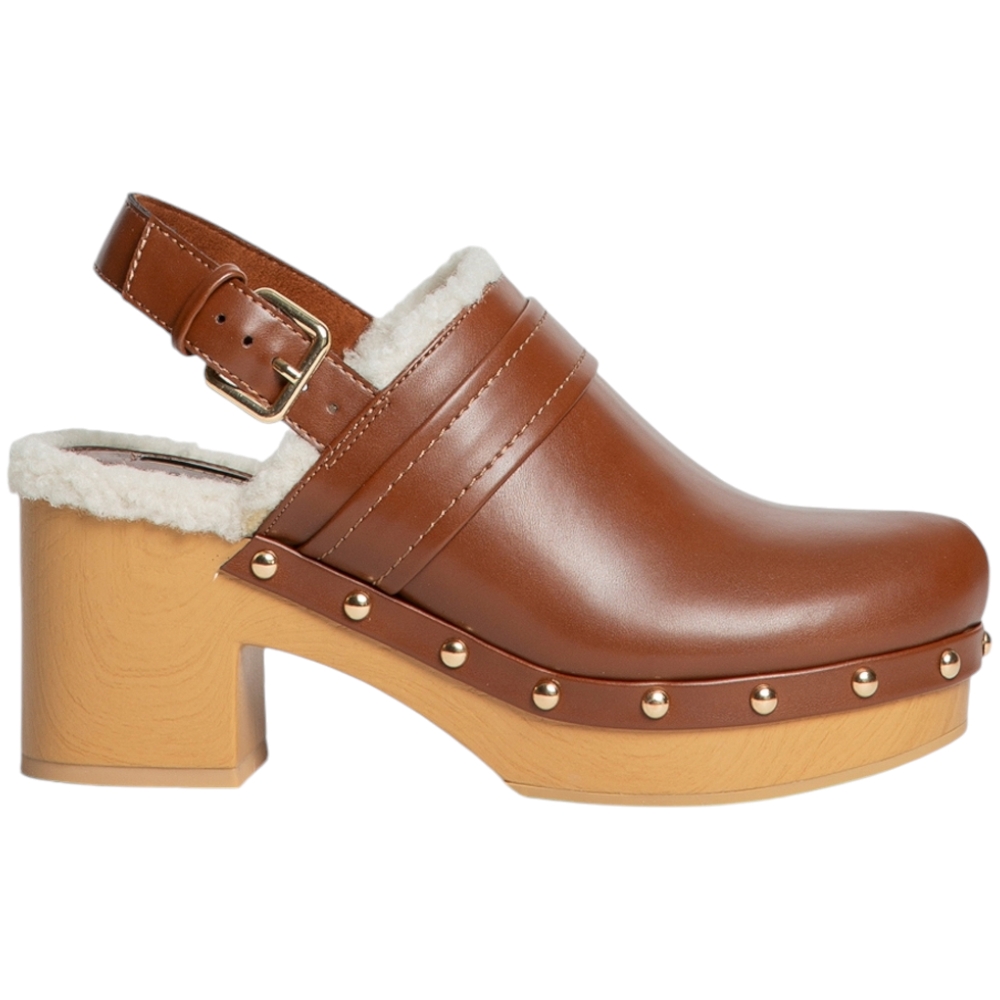 Zoccolo con tacco medio, con suola effetto legno. Dettaglio borchiato, cinturino sul tallone con fibbia esterna. fodera tipo shearling.