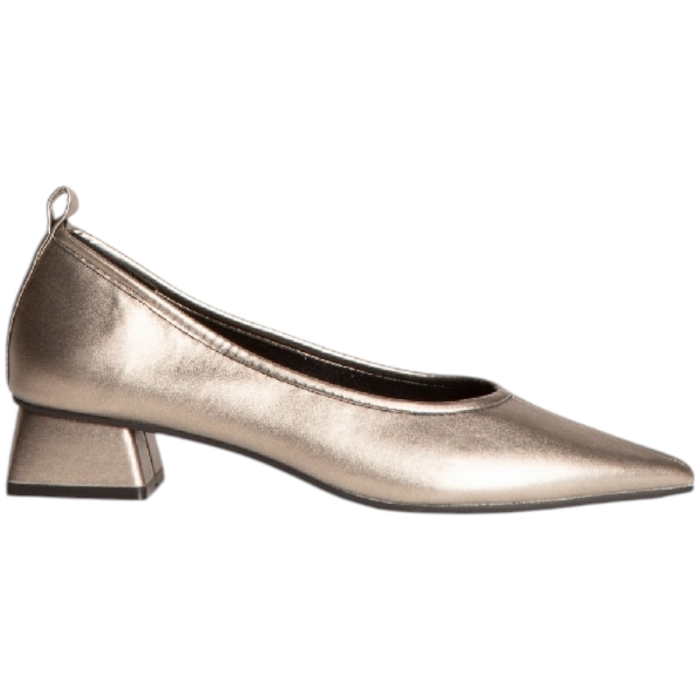 Décolleté con tacco basso. Finitura a punta. Dettaglio pull sul tallone.