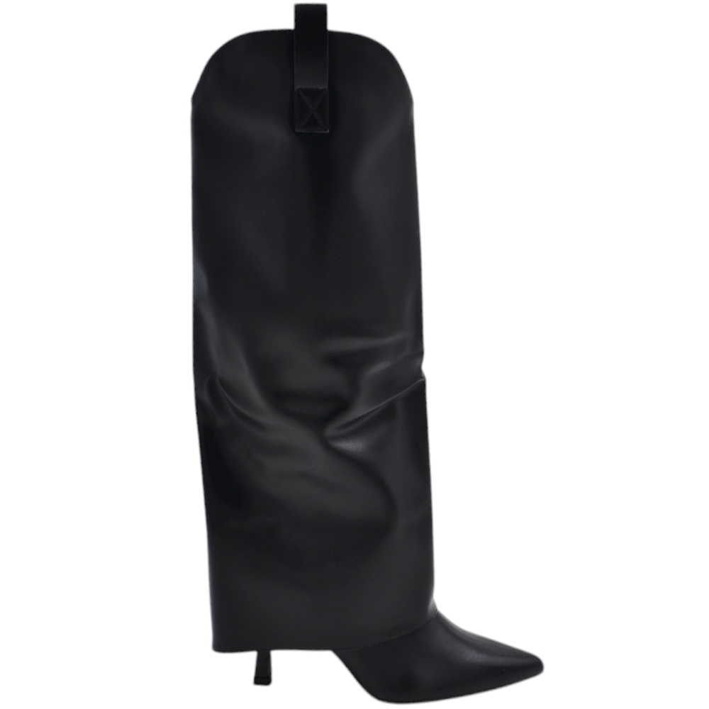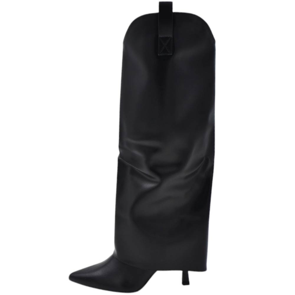 Stivali donna al ginocchio shark a punta in pelle nero con risvolto scollo a V tacco a spillo 10 zip interna nascosta