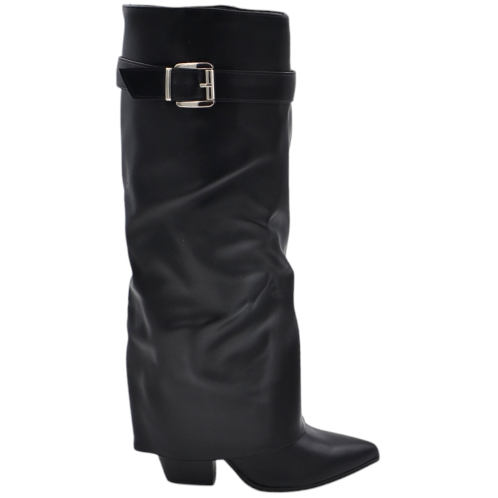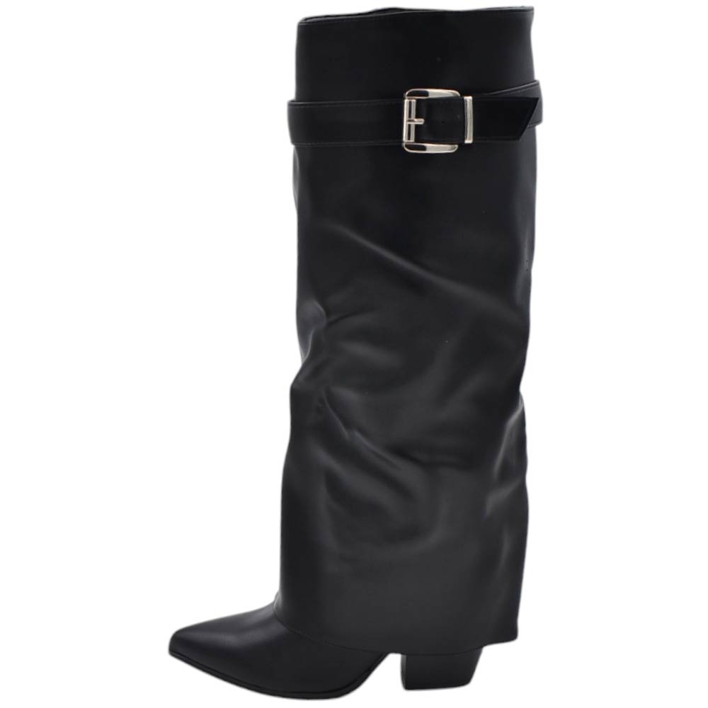 Stivali donna al ginocchio shark a punta nero con basic risvolto pelle tacco camperos 6 cm zip e fibbia