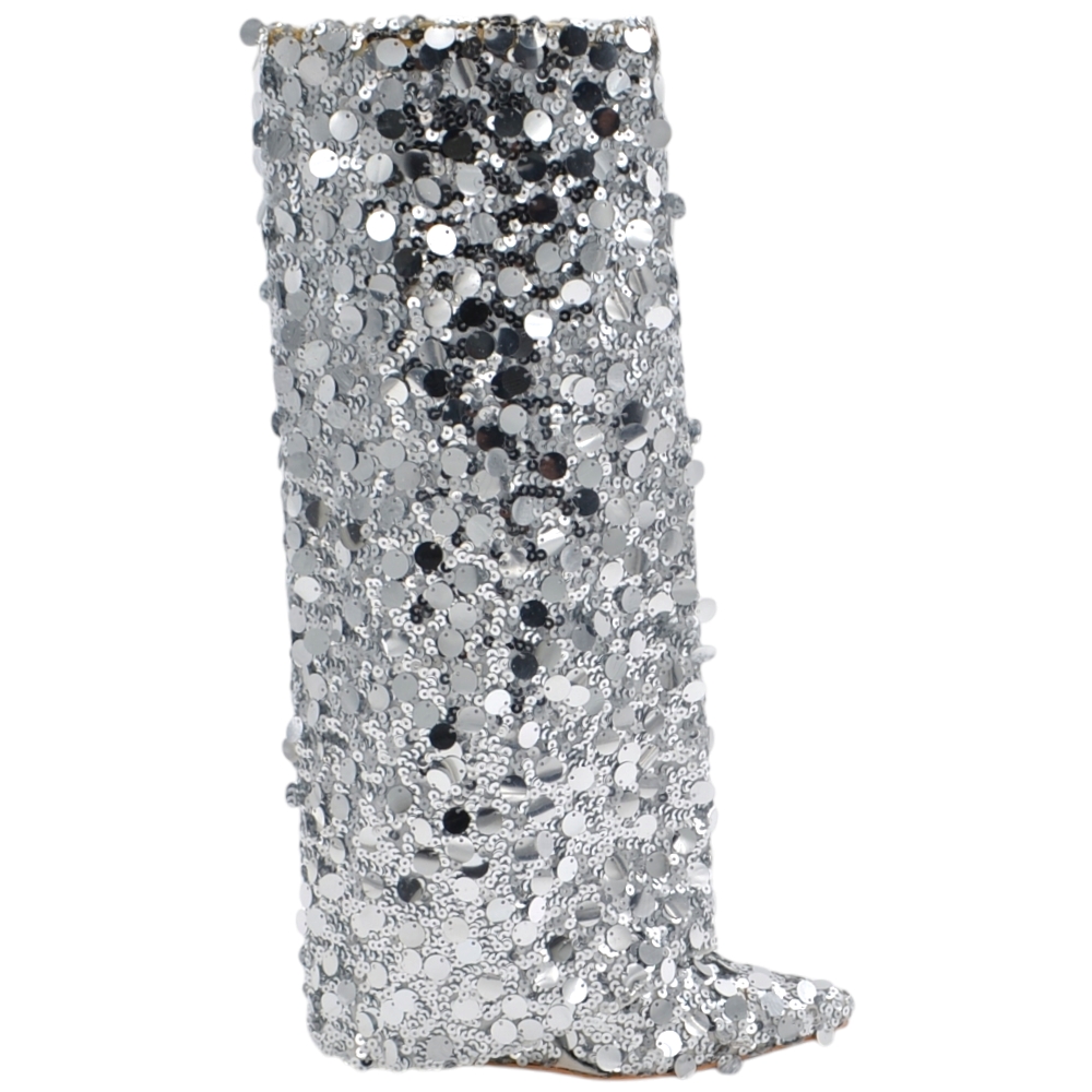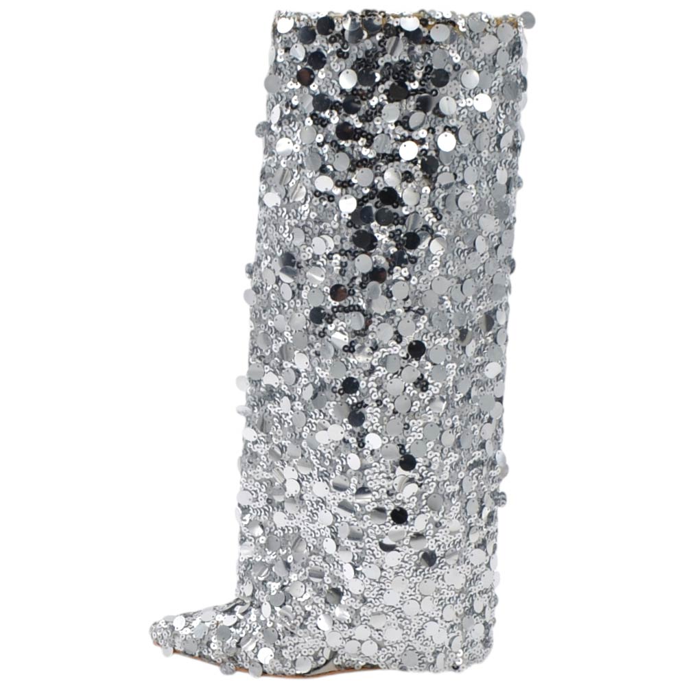 Stivali donna al ginocchio shark a punta in tessuto argento con paillettes tono su tono zeppa 10cm zip nascosta