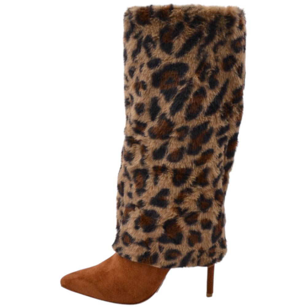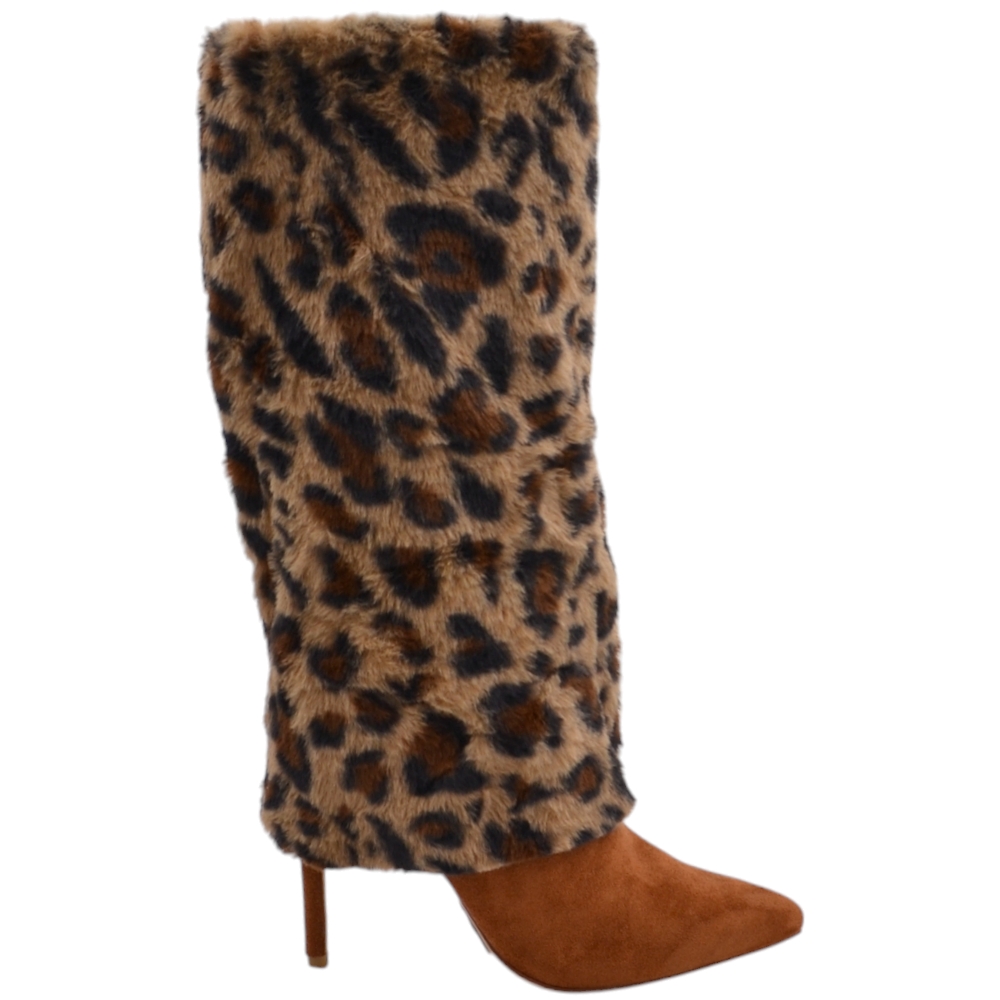 Stivali donna alti maculati a punta con risvoltone pelliccia base cuoio tacco spillo 10 cm shark