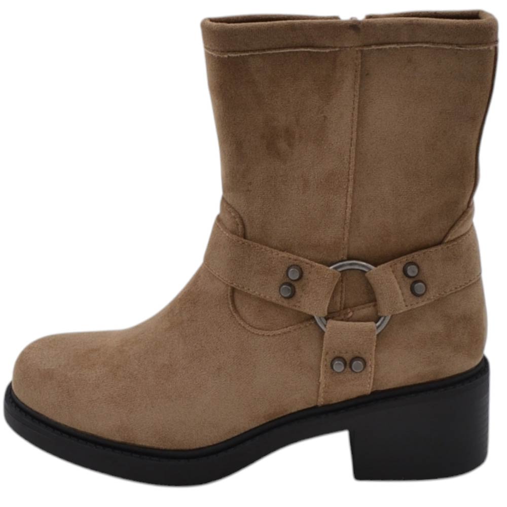 Stivaletto biker donna con fondo roccia alto in camoscio kakhi fibbia cowboy argento zip laterale pelliccia interna