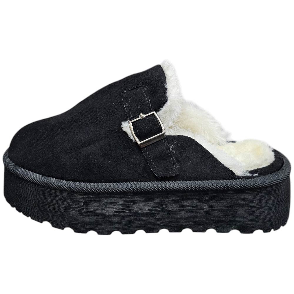 Ciabatta pantofola donna nero con interno di pelliccia e fibbia comodo fondo alto 3 cm.