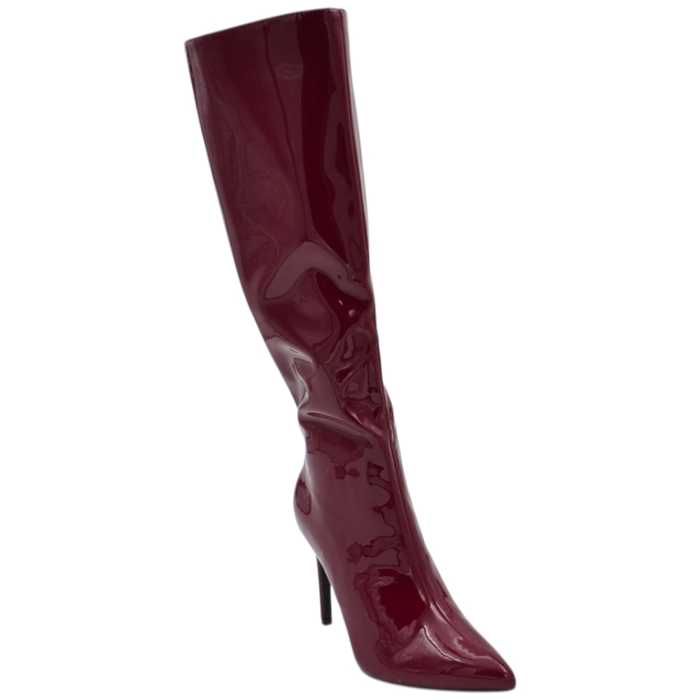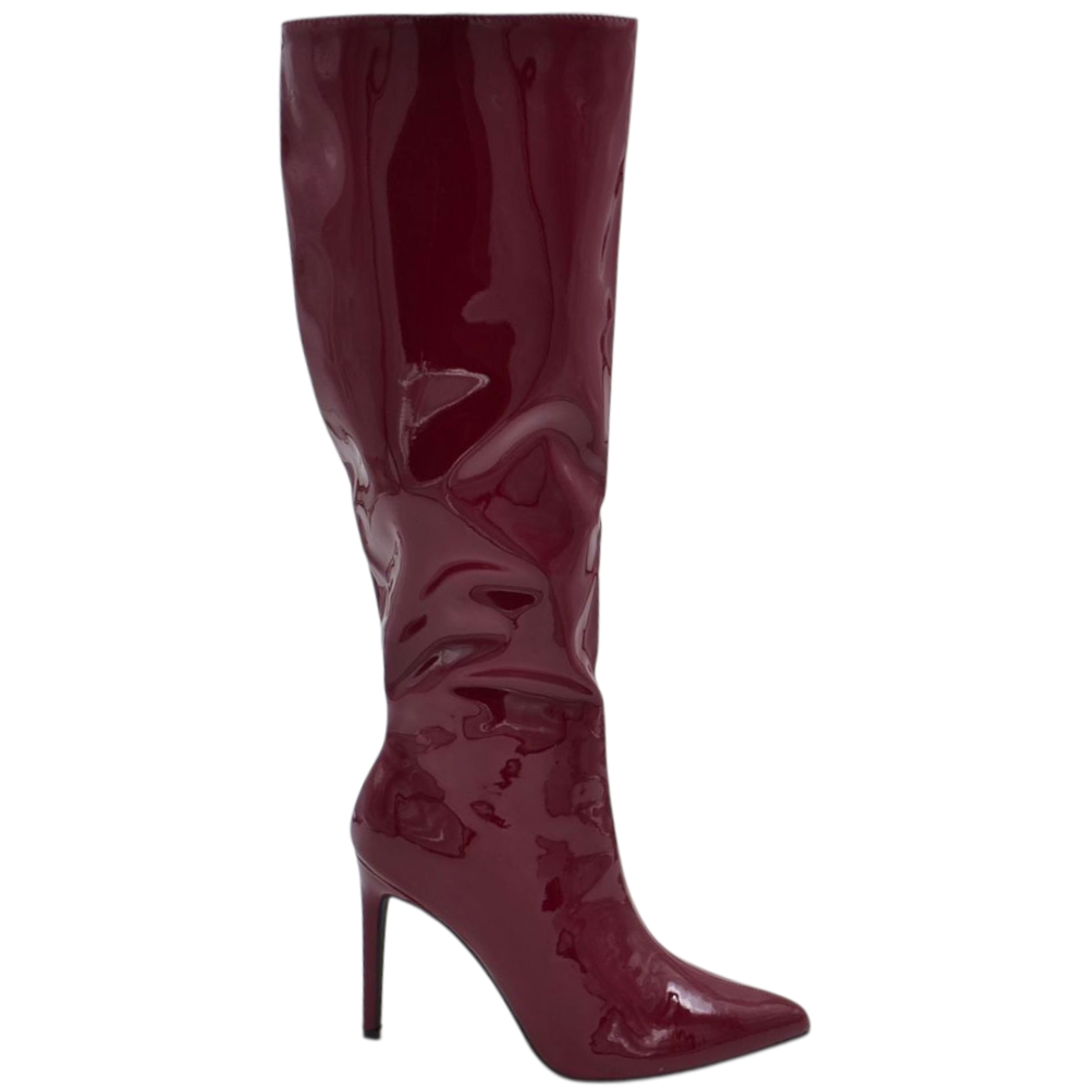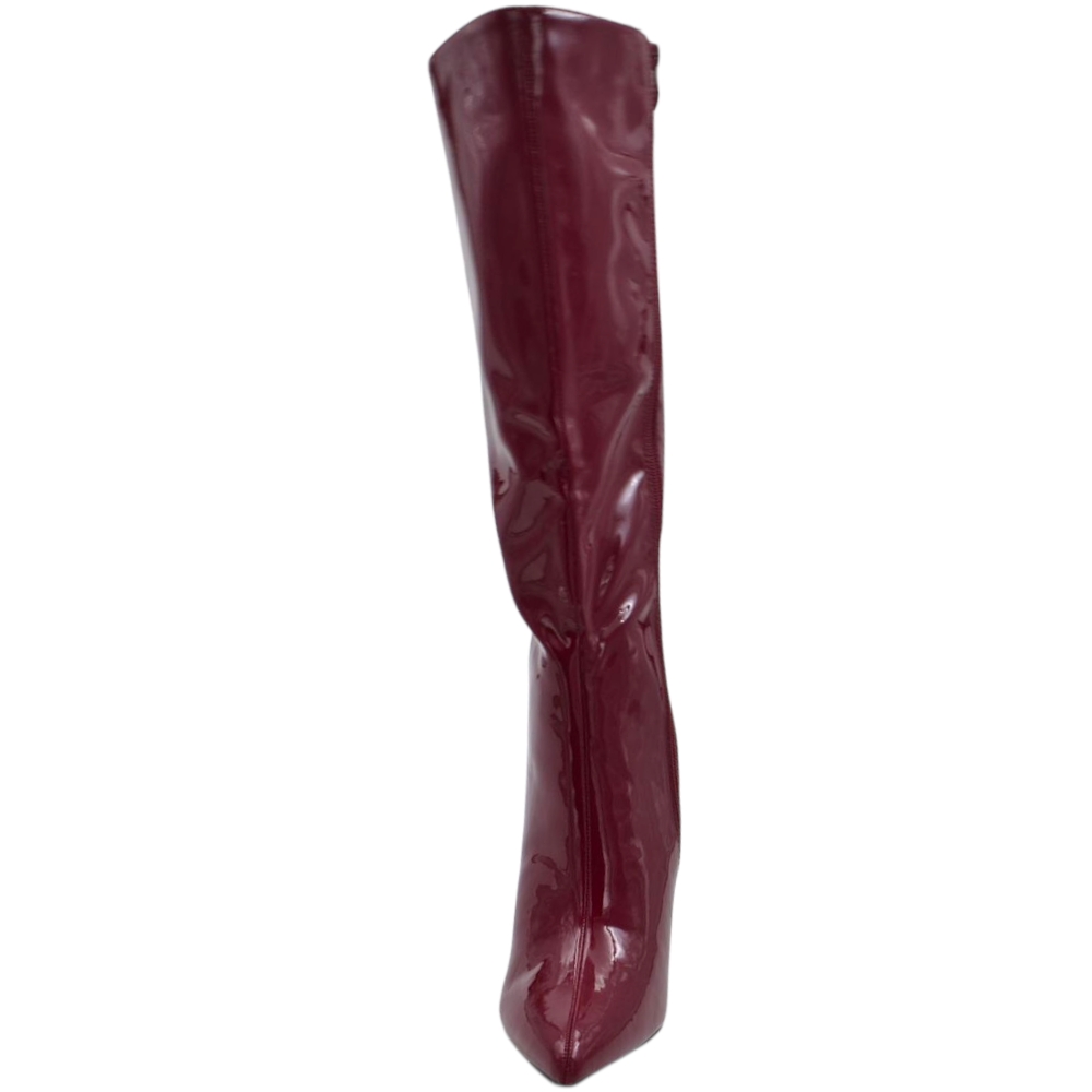 Stivale alto donna bordeaux a punta lucido vernice effetto calzino con tacco a spillo sottile 12 cm aderente zip moda