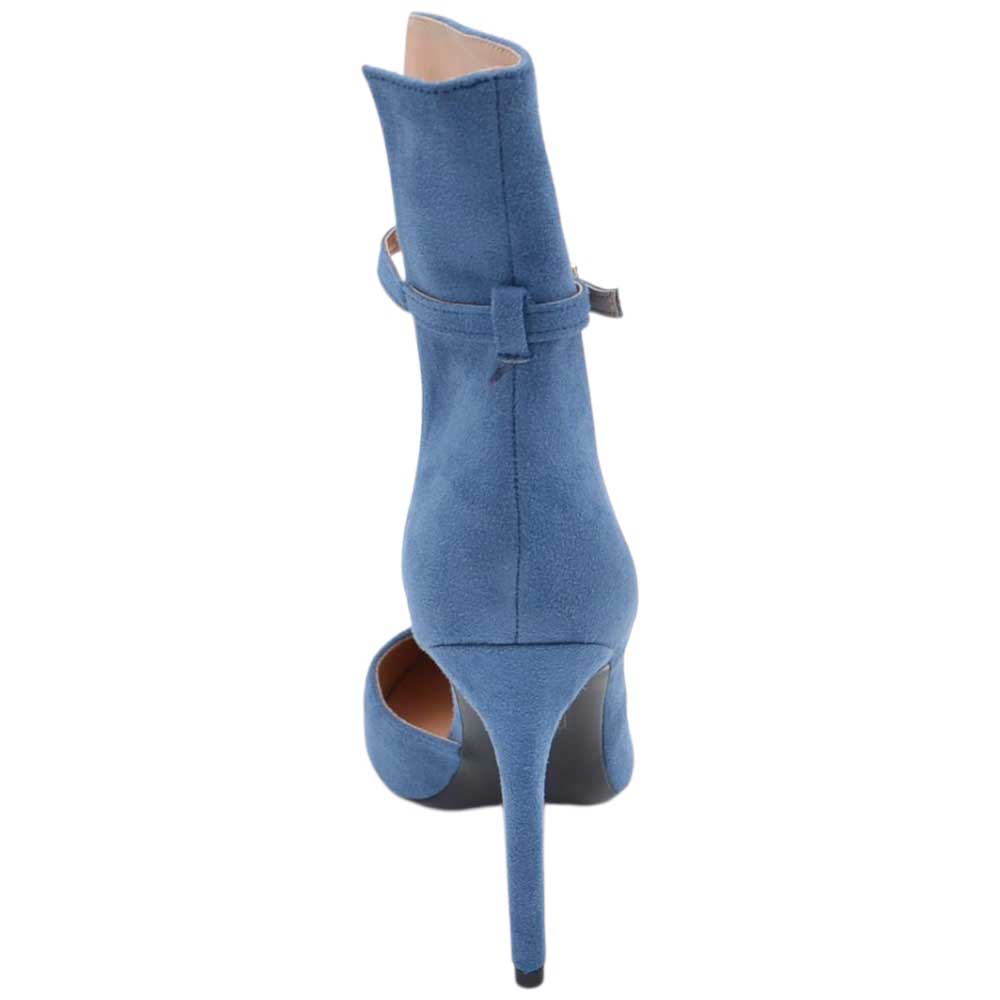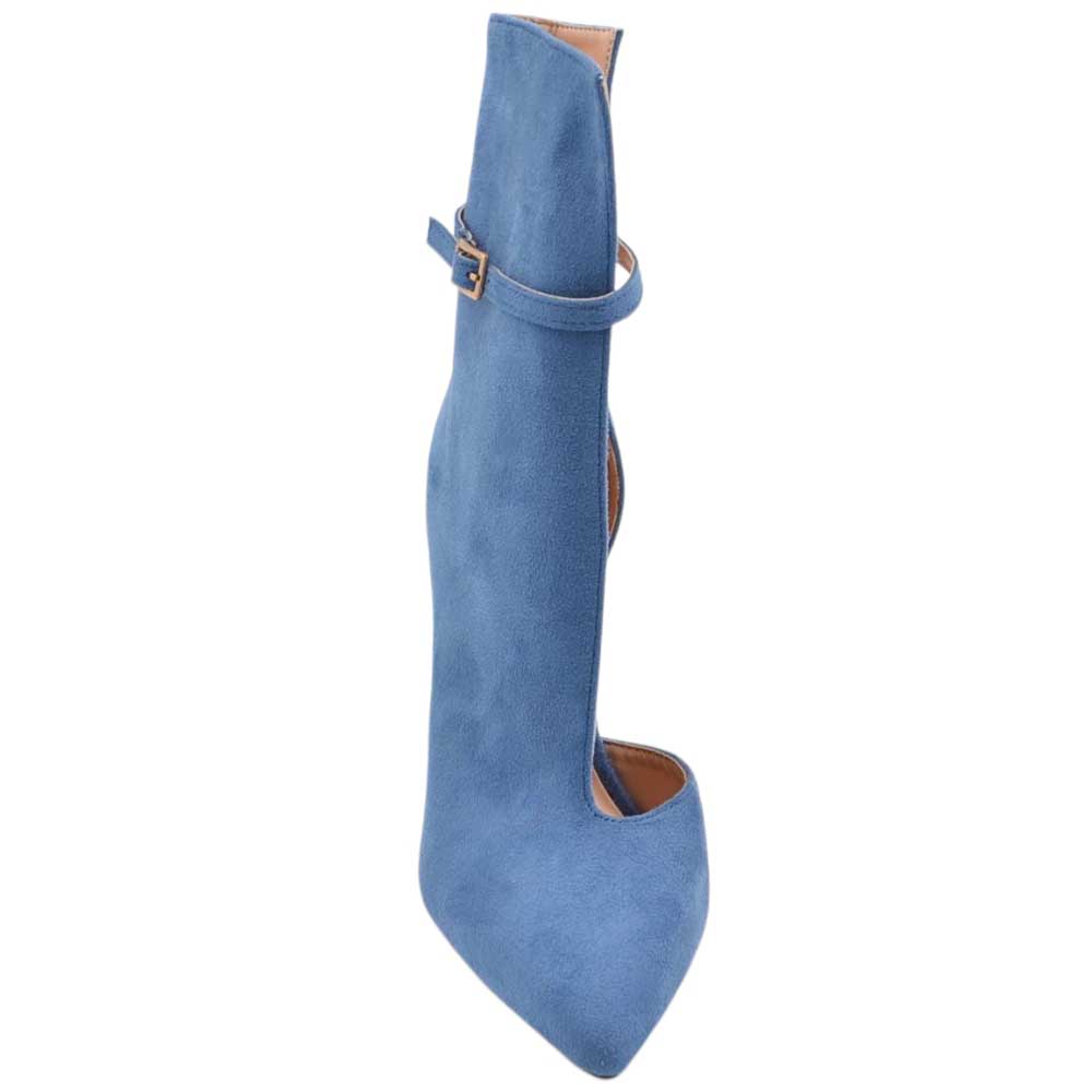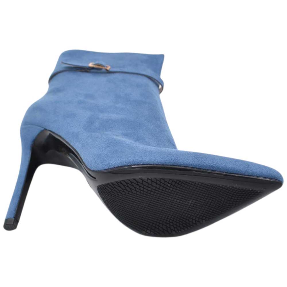 Stivaletto donna tronchetto open cut in camoscio blu avion a punta con tacco a spillo 12 cm e cinturino alla caviglia