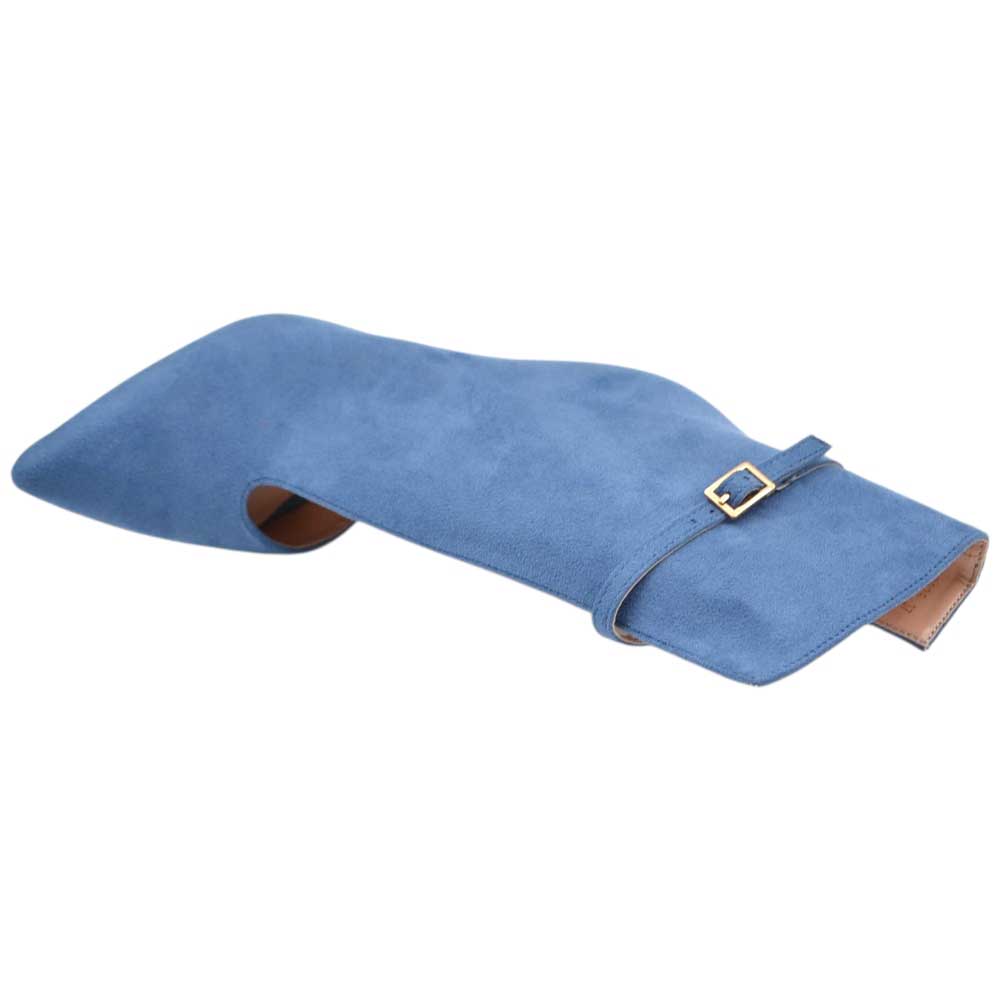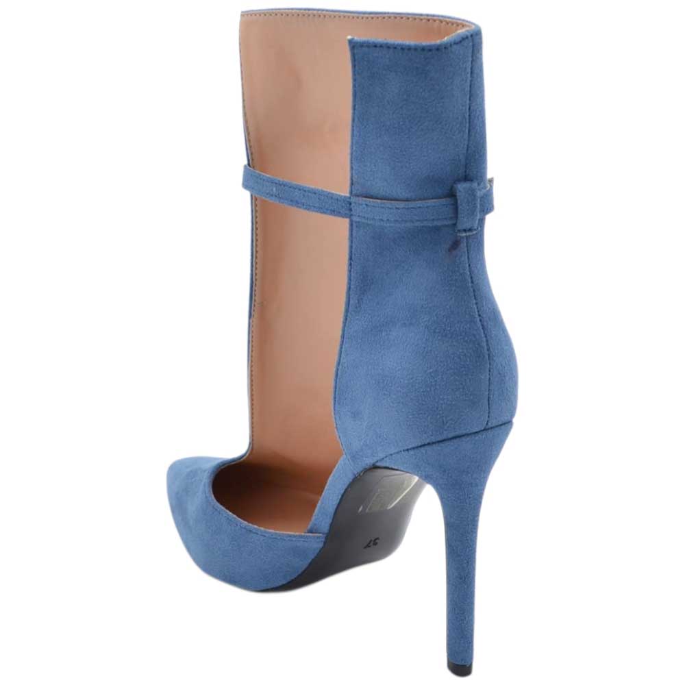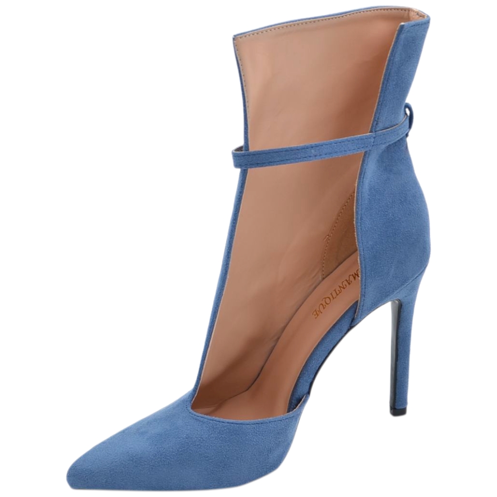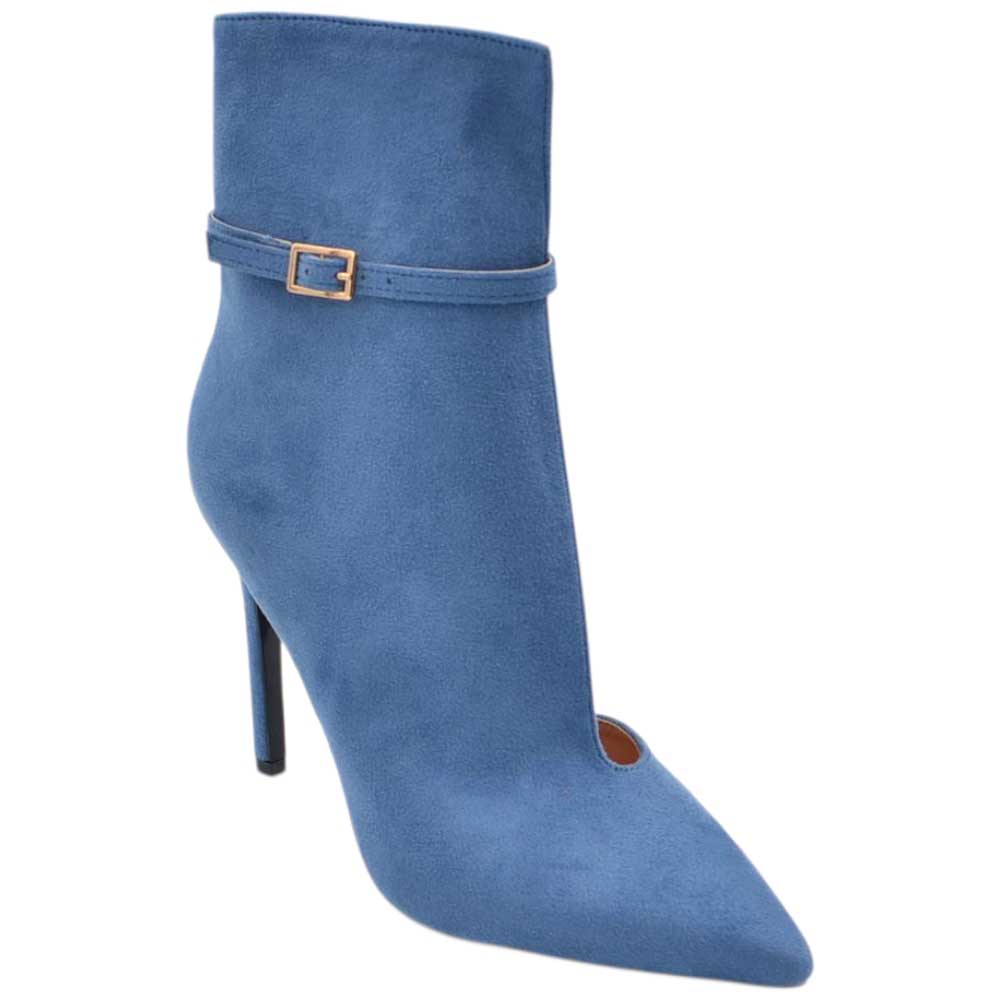 Stivaletto donna tronchetto open cut in camoscio blu avion a punta con tacco a spillo 12 cm e cinturino alla caviglia