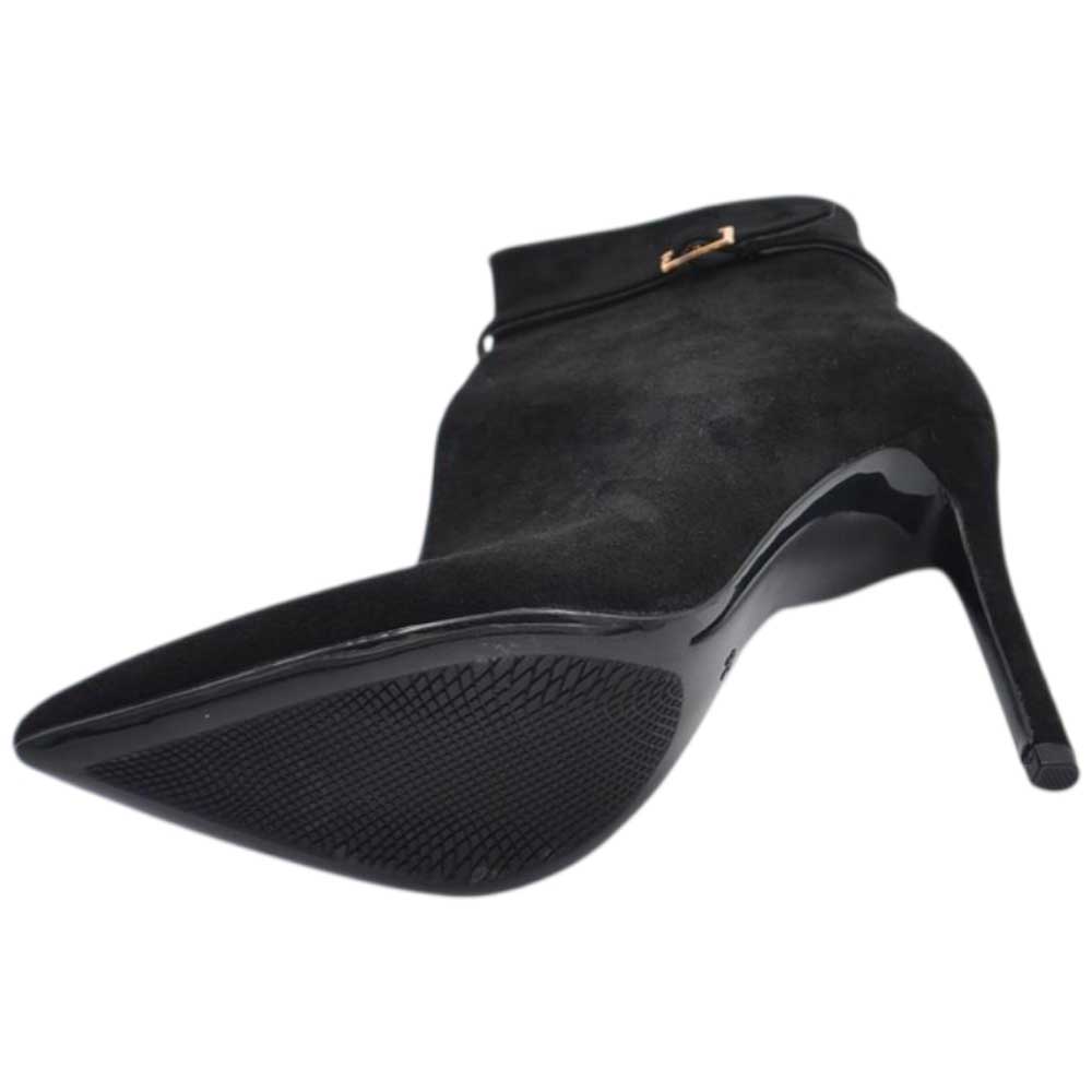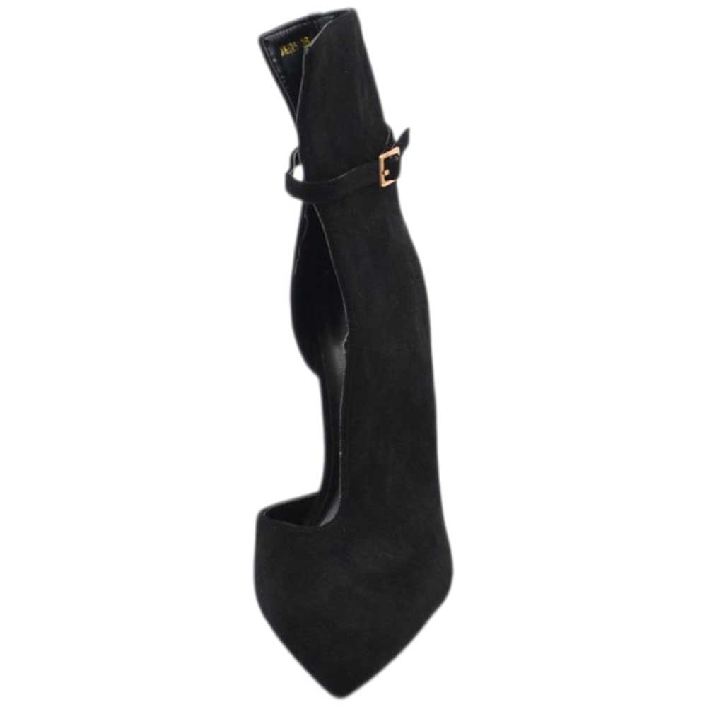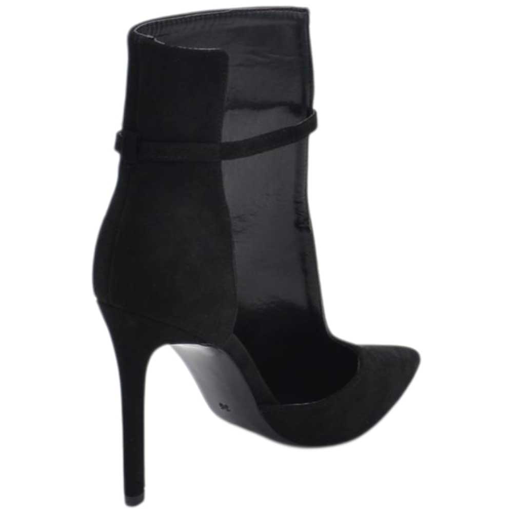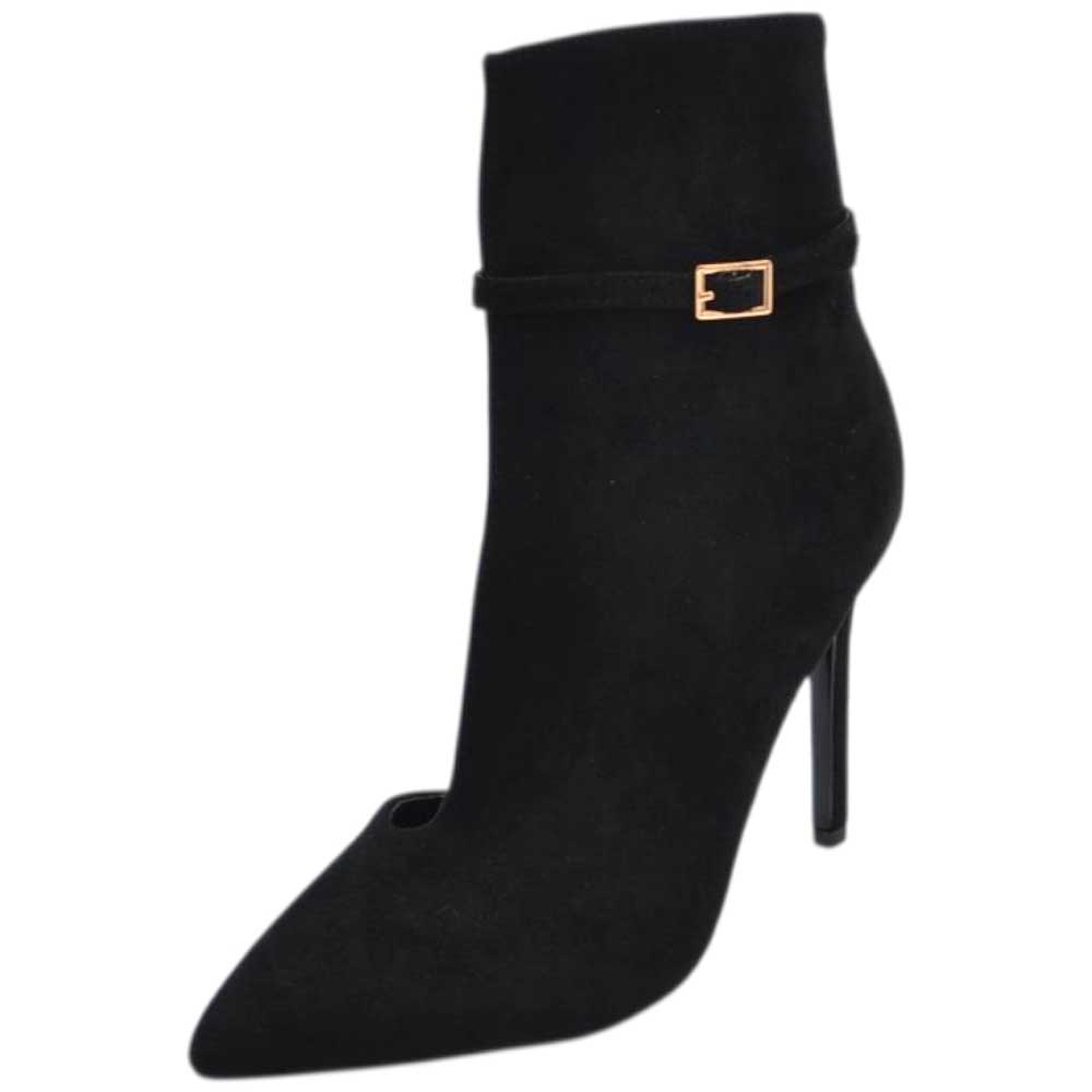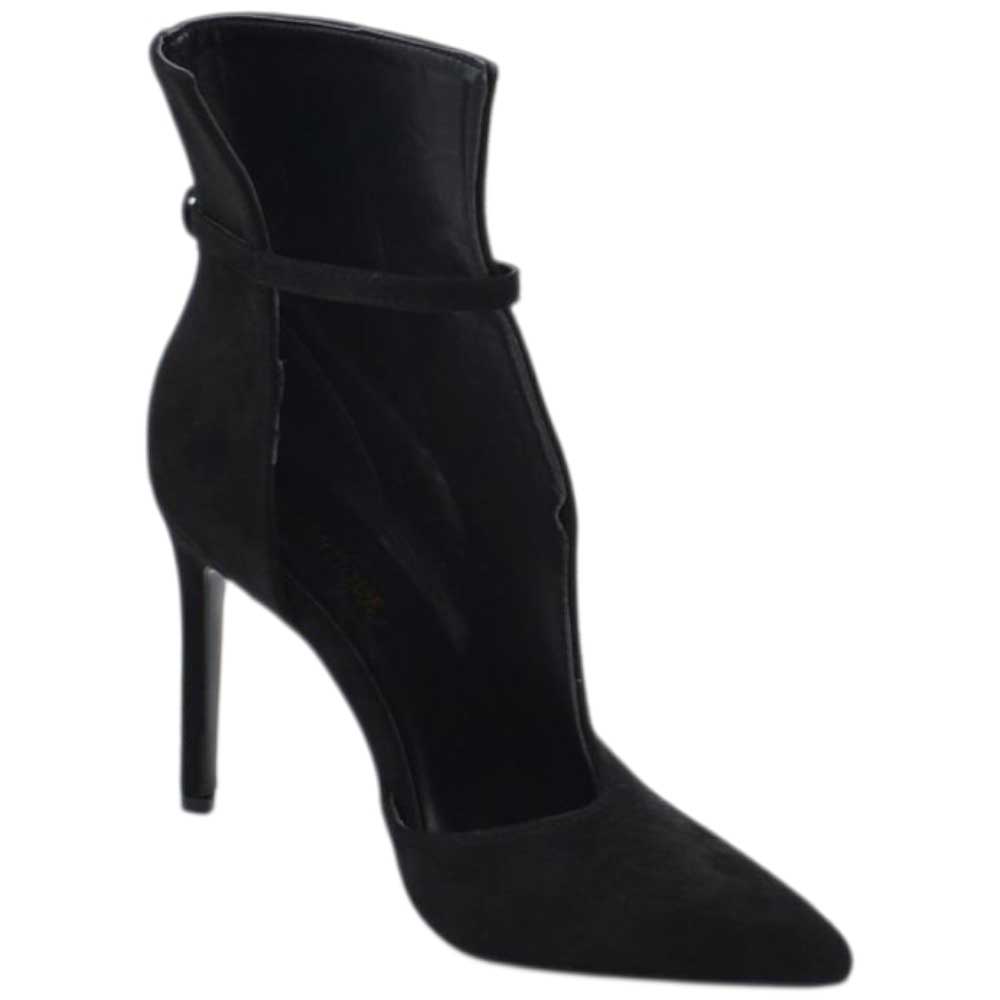 Stivaletto donna tronchetto open cut in camoscio nero a punta con tacco a spillo 12 cm e cinturino alla caviglia