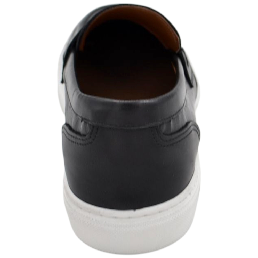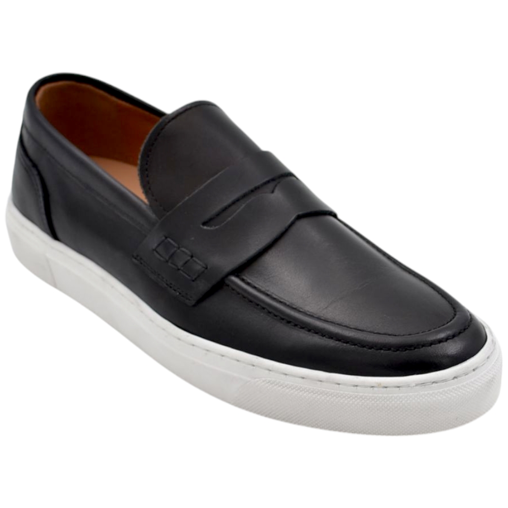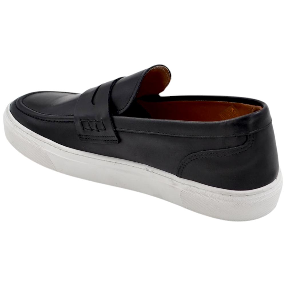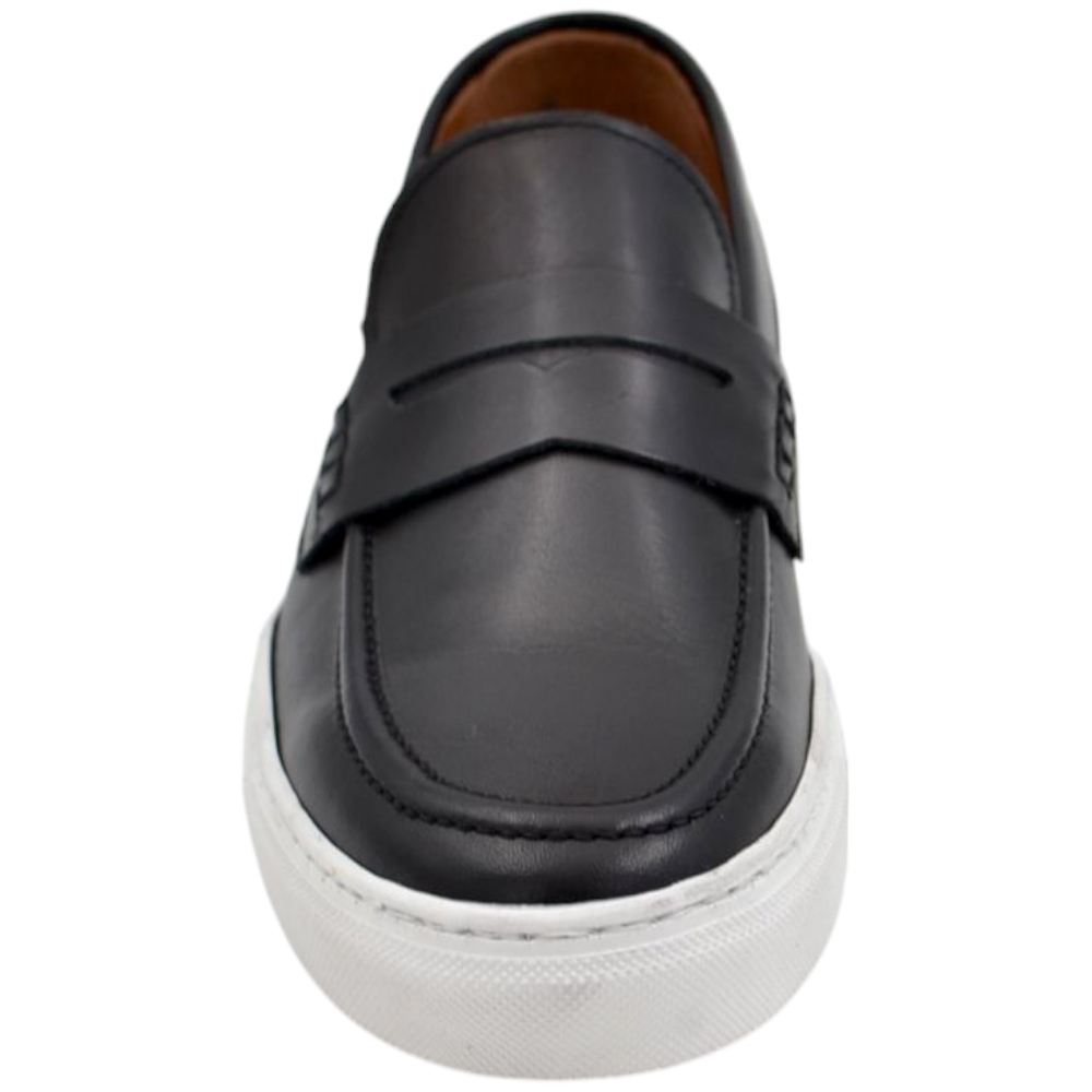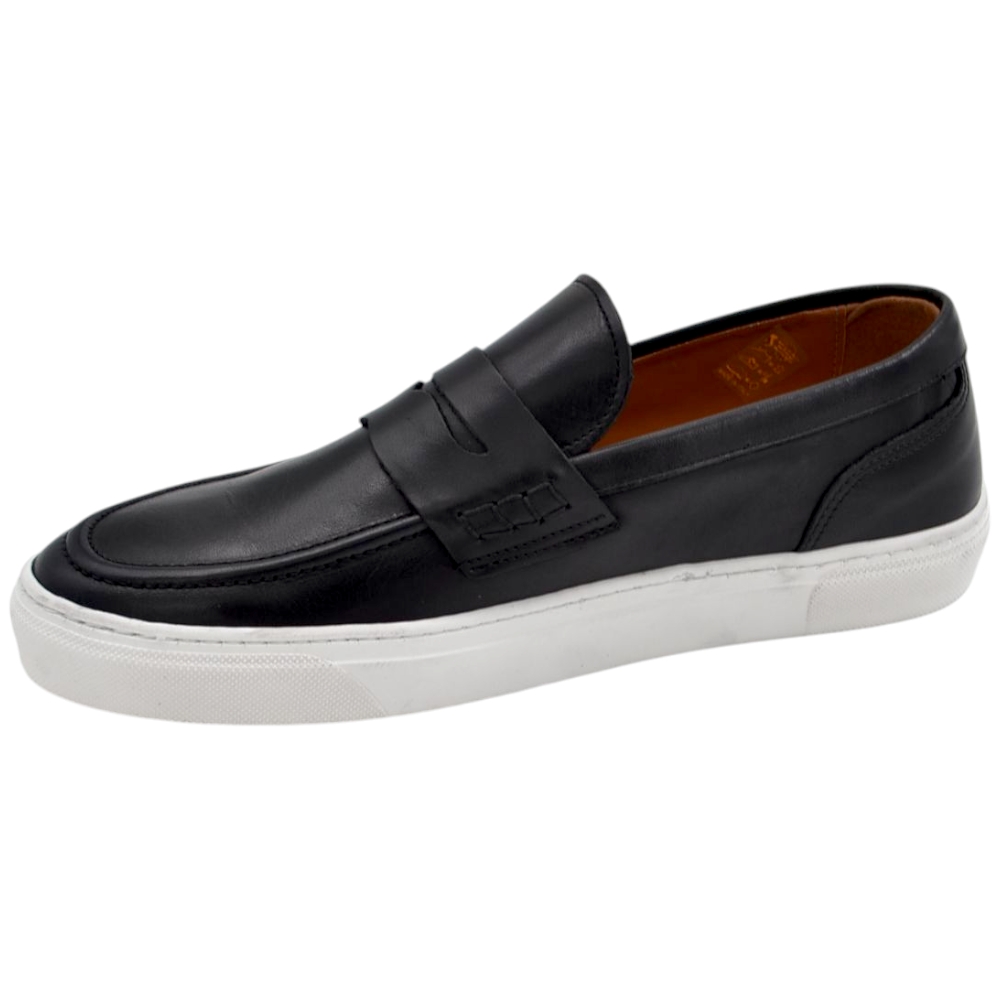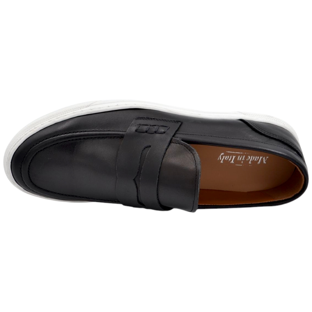 Mocassino uomo in vera pelle nappa nero spazzolato con bendina fondo classico sportivo gomma bianco 2,5 cm