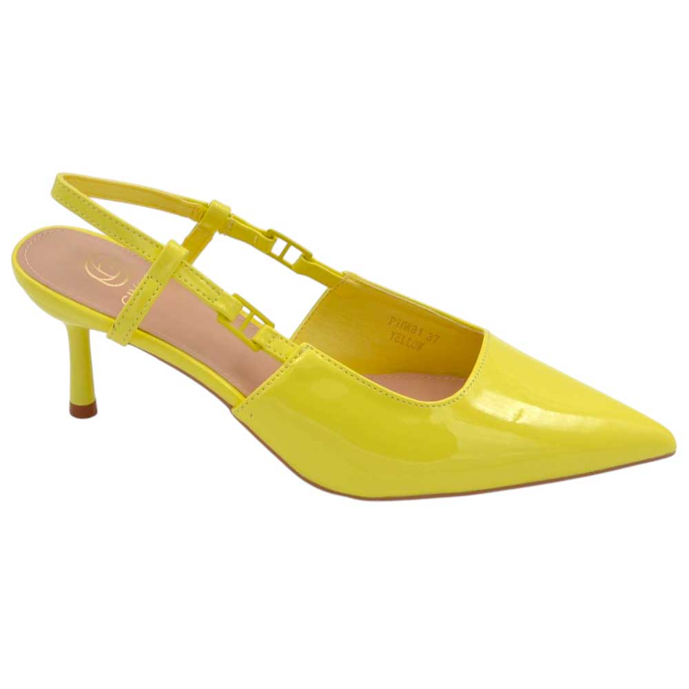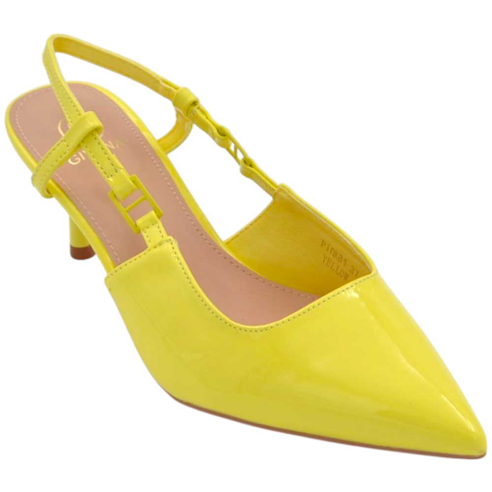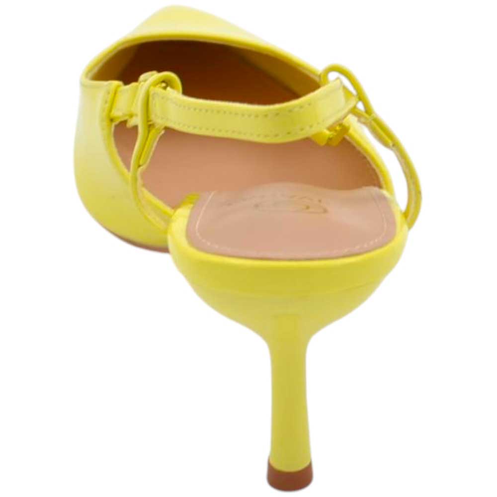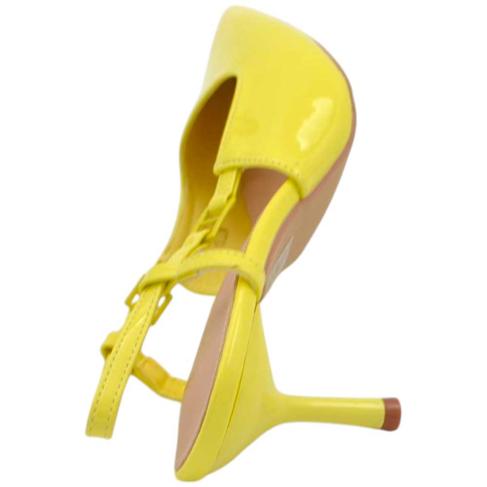 Decolette' donna in pelle lucida gialla punta tacco sottile 5 cm cinturino regolabile tallone