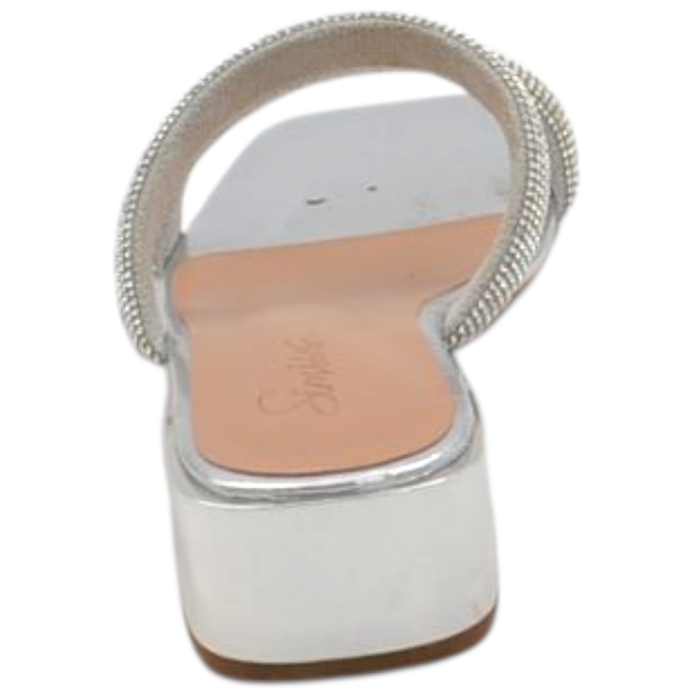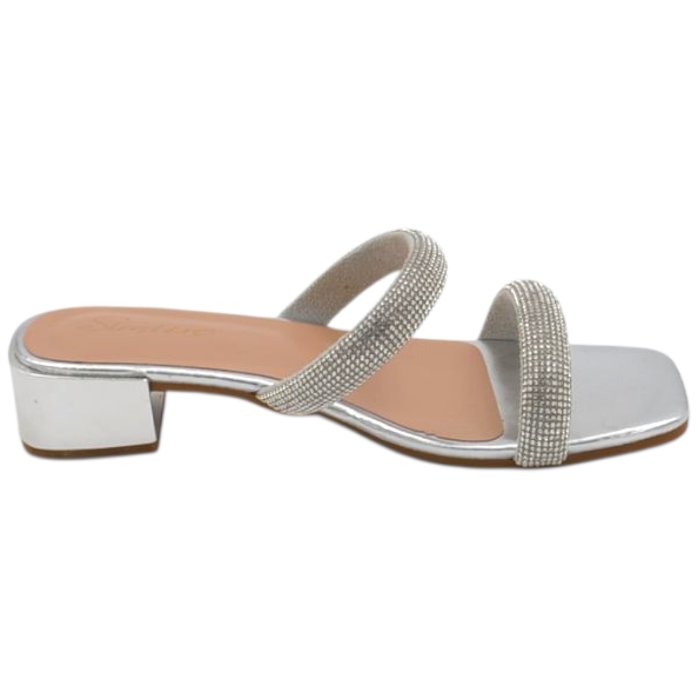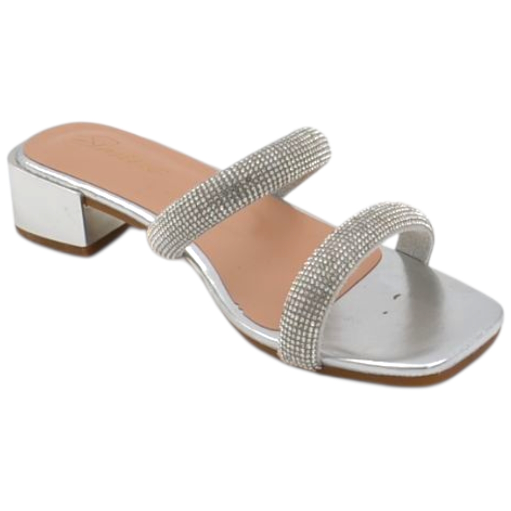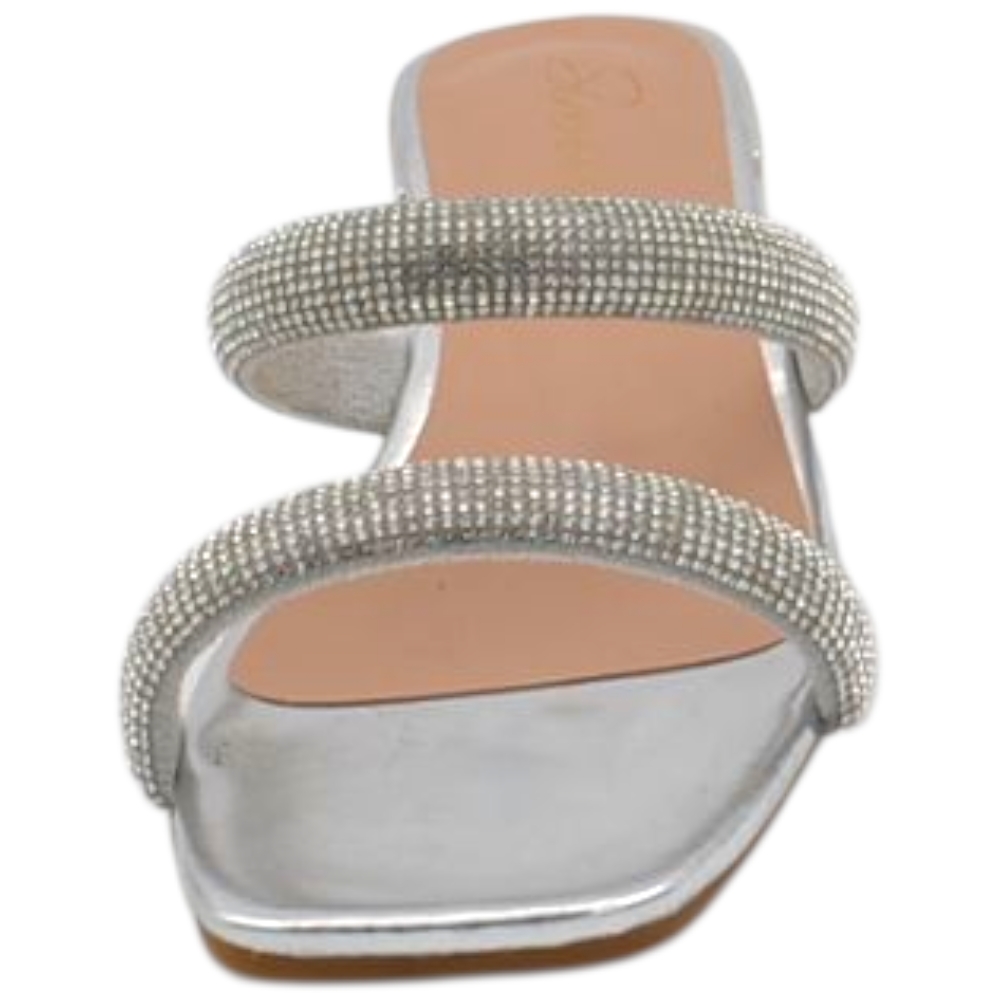 Sandali donna gioiello mule aperti argento lucido fascette brillantini tacco doppio 2 cm comode eleganti