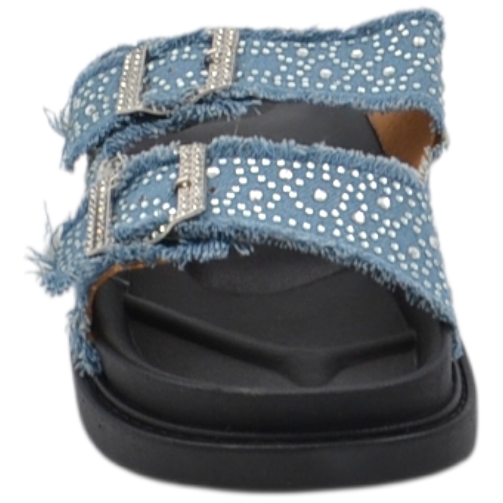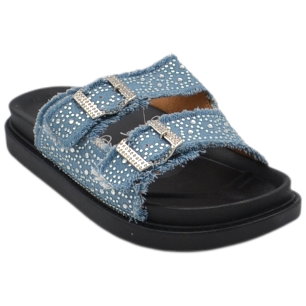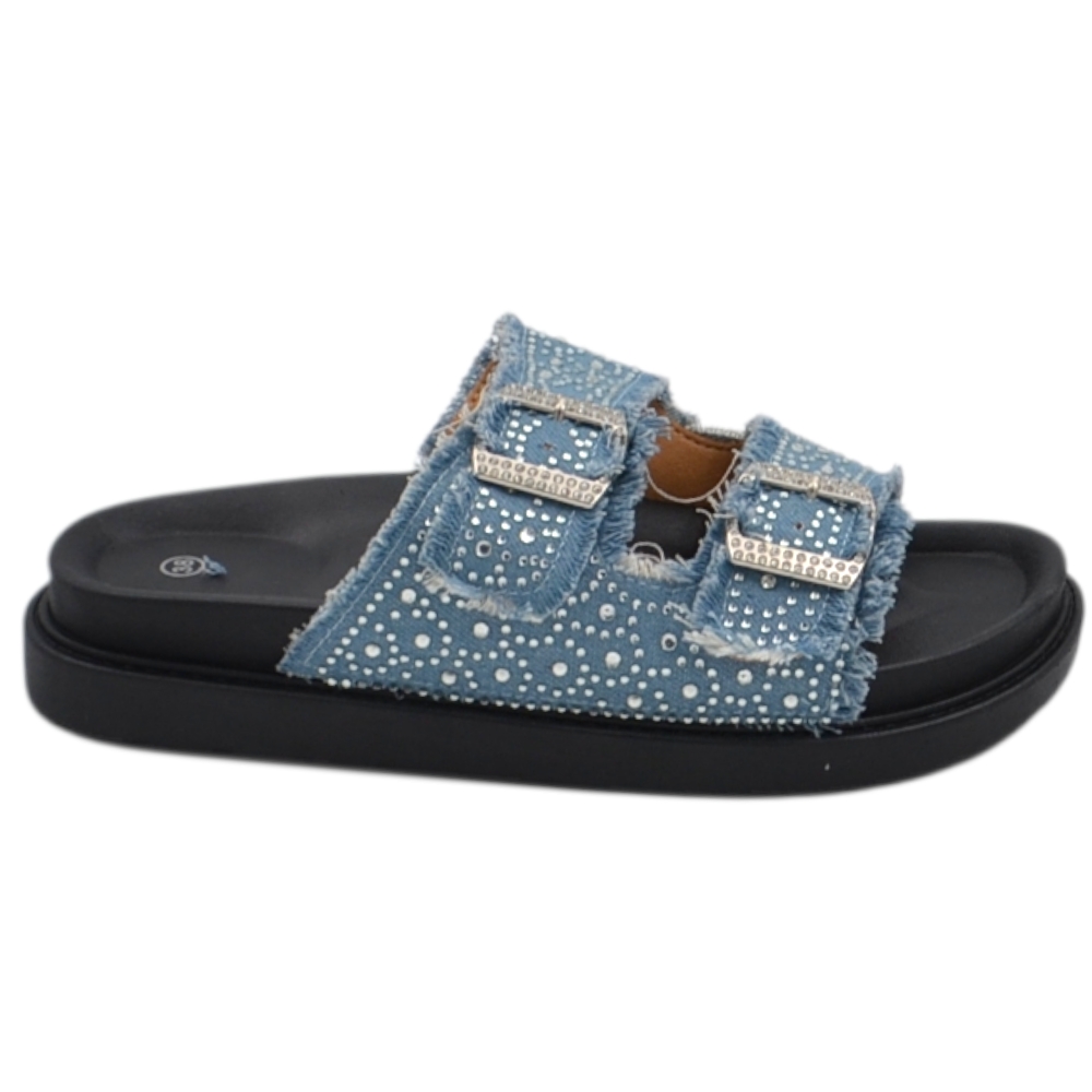 Pantofoline platform donna con doppia fibbia tessuto jeansato chiaro e brillantini suola comfort 4 cm