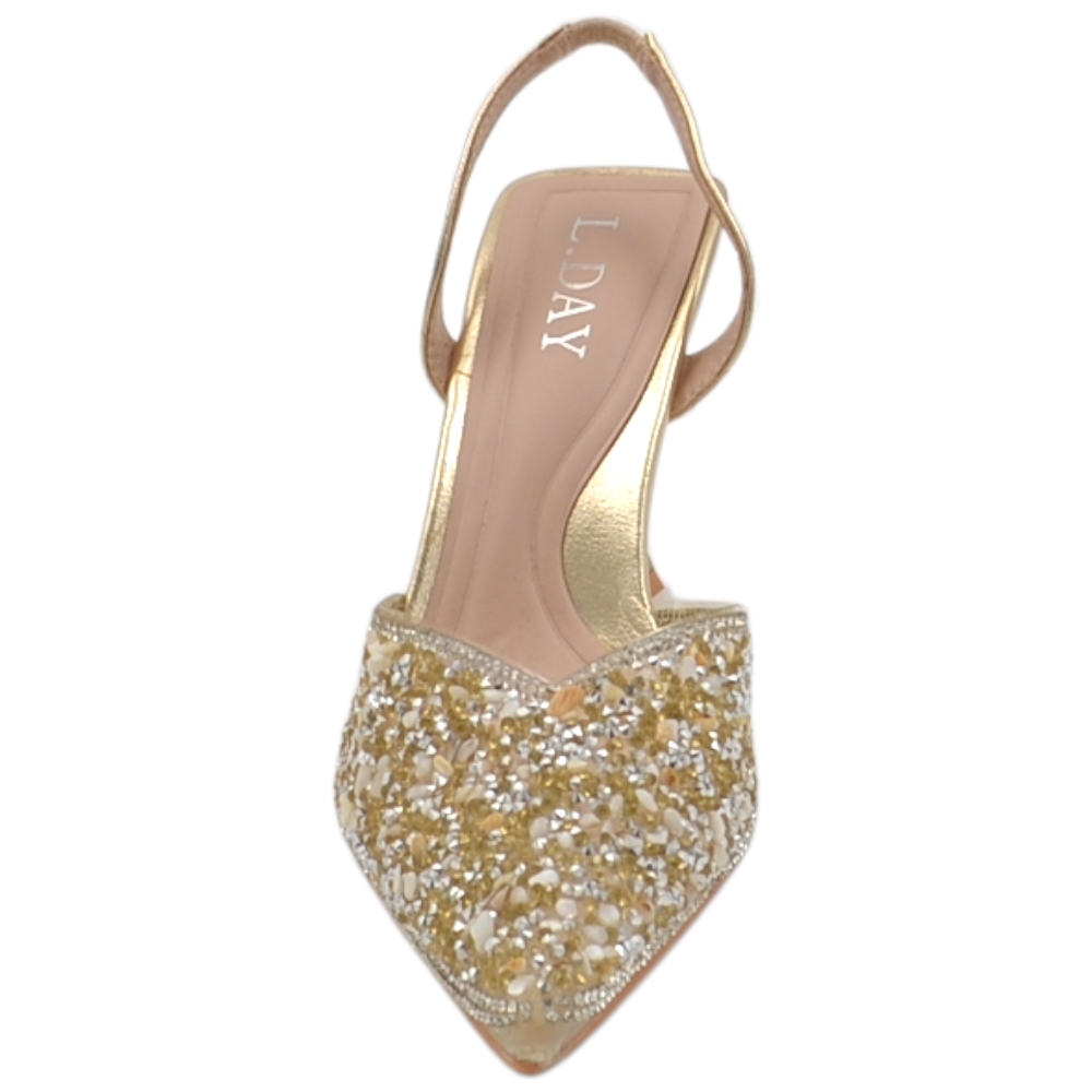 Decollete gioiello donna oro con scollo a v aperto sul tallone tacco clessidra 8 cm elegante cerimonia evento sposa