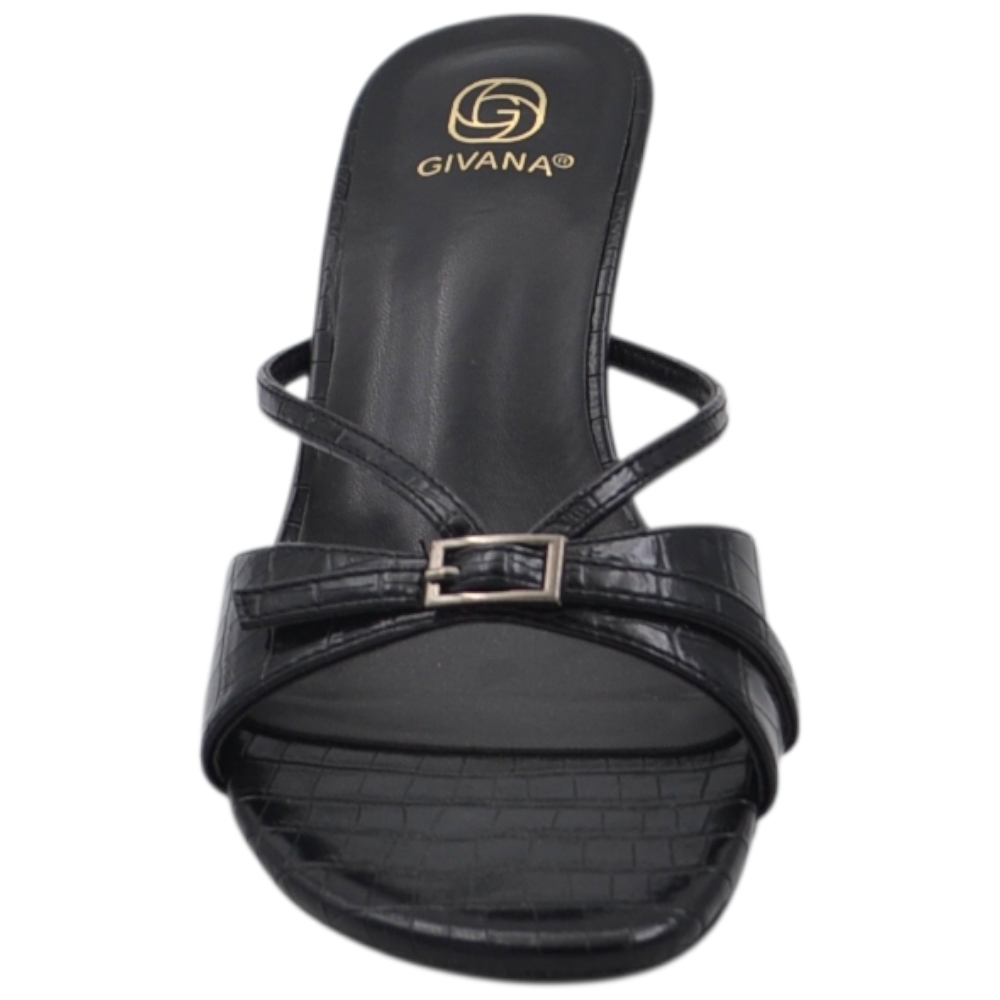 Sandalo tacco mules donna in pelle nero fasce sottili all'avampiede fibbia argento senza chiusura tacco 7cm