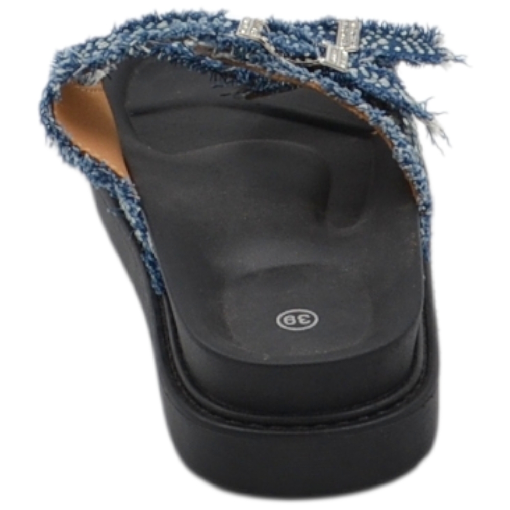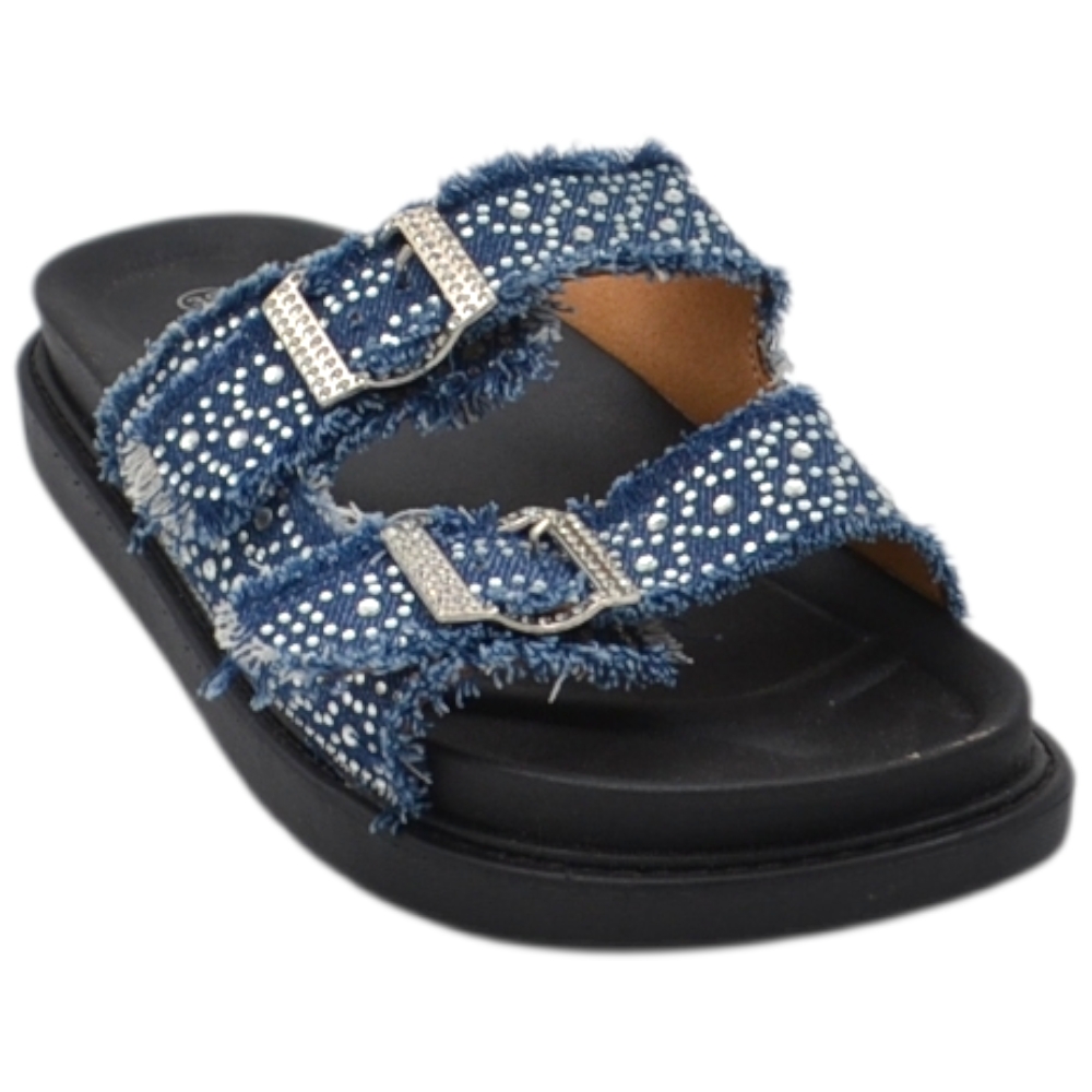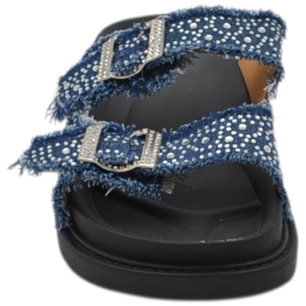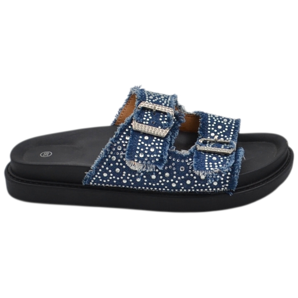 Pantofoline platform donna con doppia fibbia tessuto jeansato blue denim brillantini suola comfort 4 cm