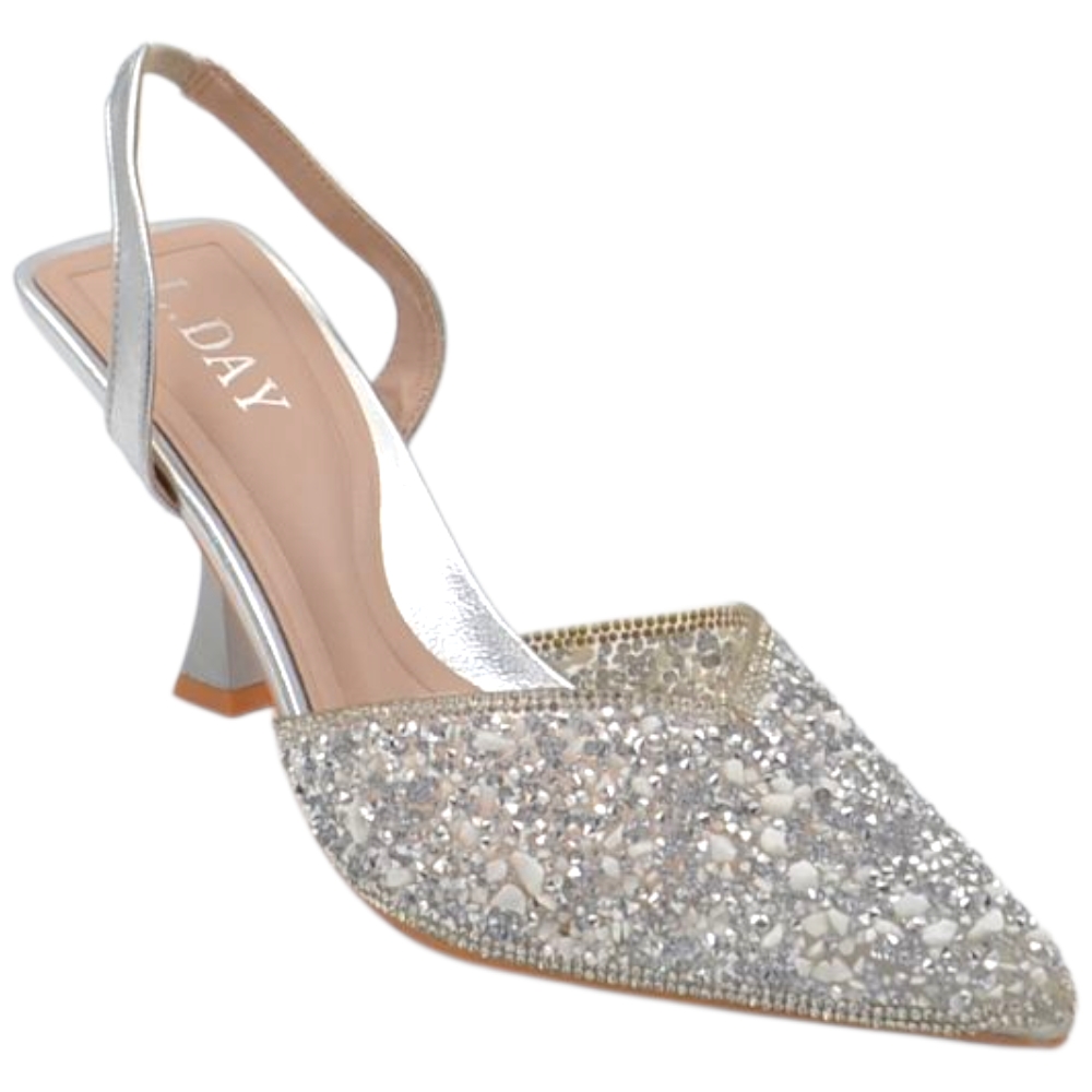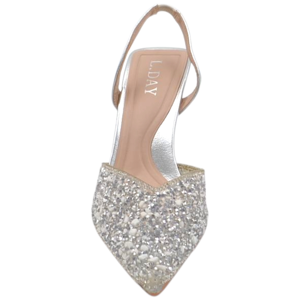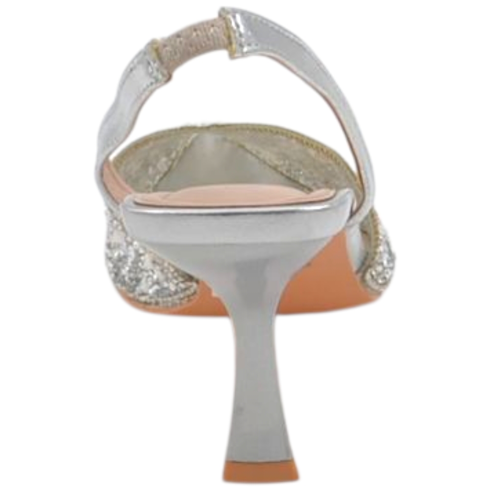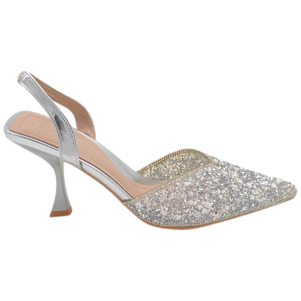 Decollete gioiello donna argento con scollo a v aperto sul tallone tacco clessidra 8 cm elegante cerimonia evento sposa