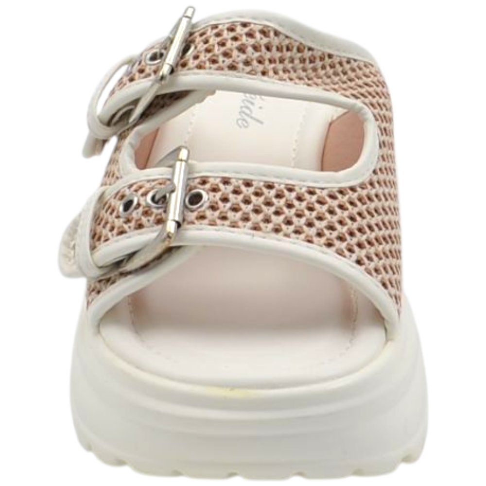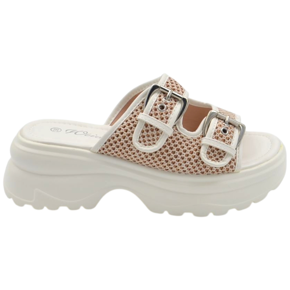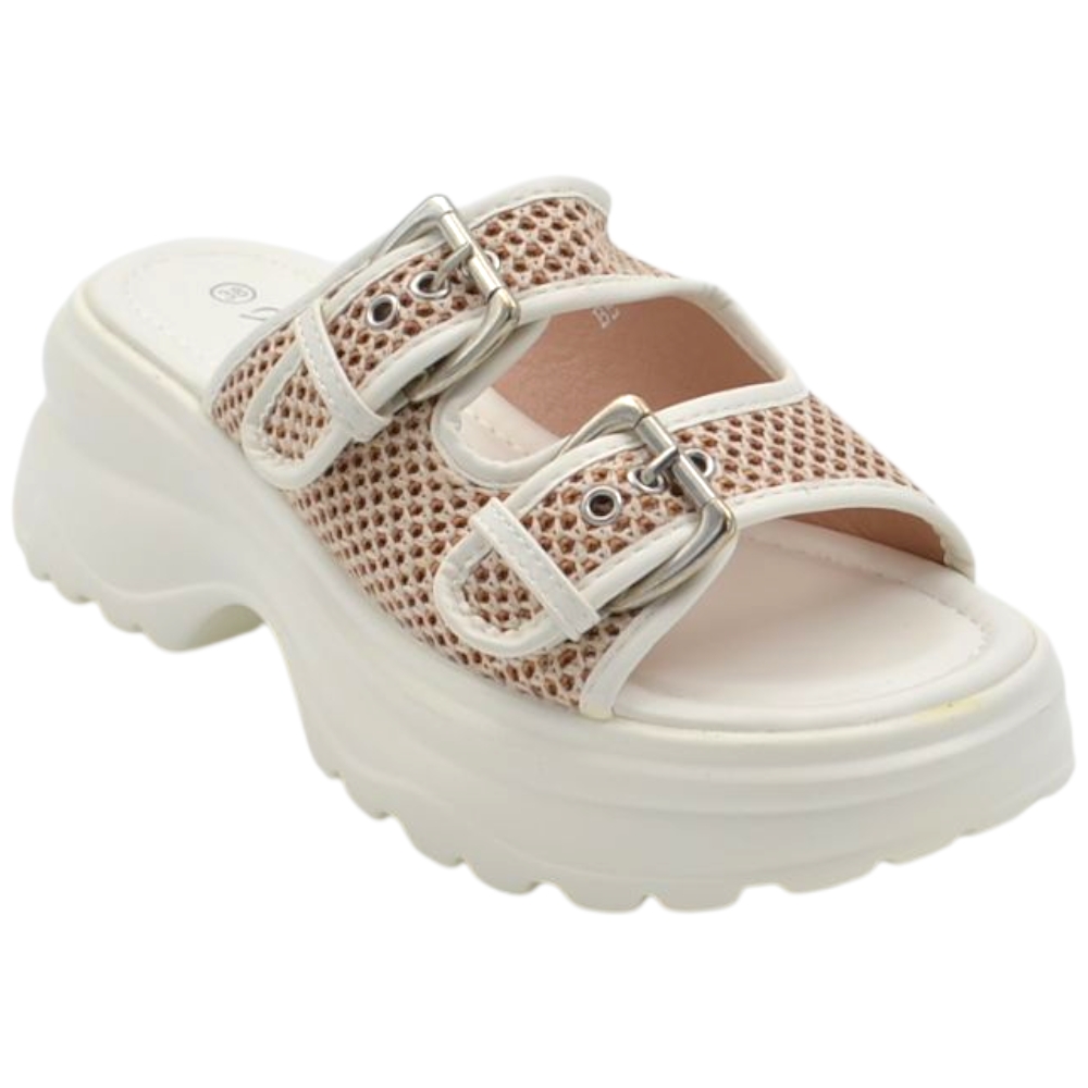 Pantofoline zeppa platform donna con doppia fibbia tessuto nido d'ape bianca suola combat 7 cm zigrinato