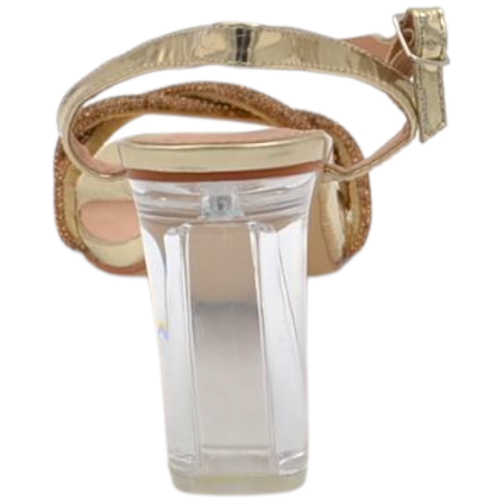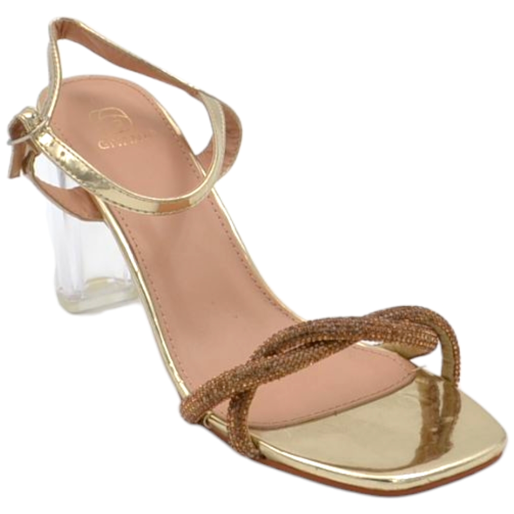 Sandalo donna gioiello oro con strass tacco trasparente largo 10 cm cerimonia cinturino alla caviglia