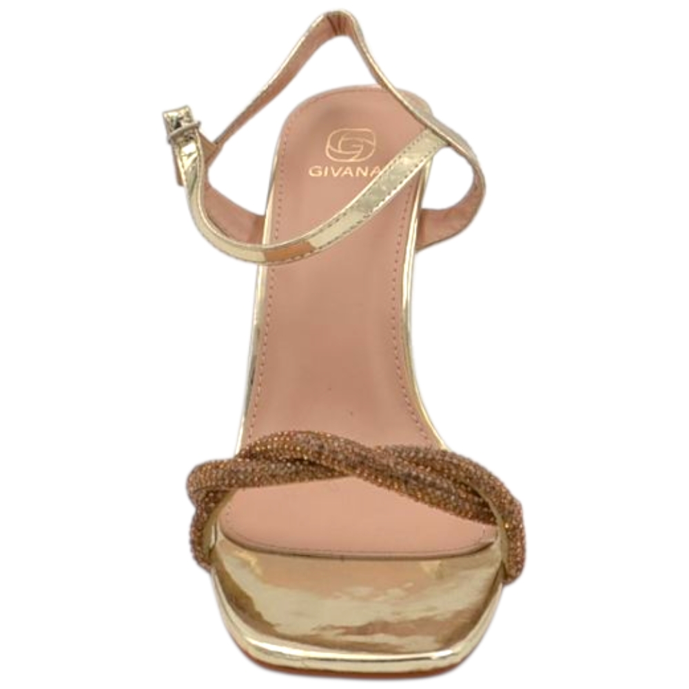 Scarpe sandalo donna oro pelle con fasce a incrocio strass argento e chiusura con zip retro tacco largo comodo 5cm.