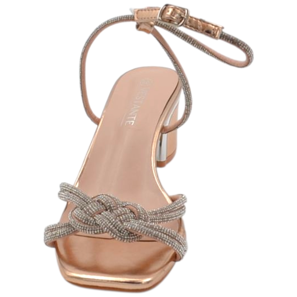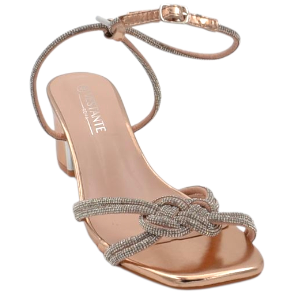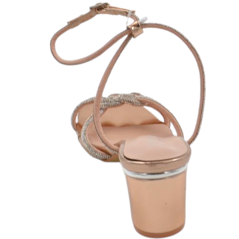 Sandali gioiello donna con tacco basso largo 5 cm con nodo bicolore oro rosa argento comodo elegante