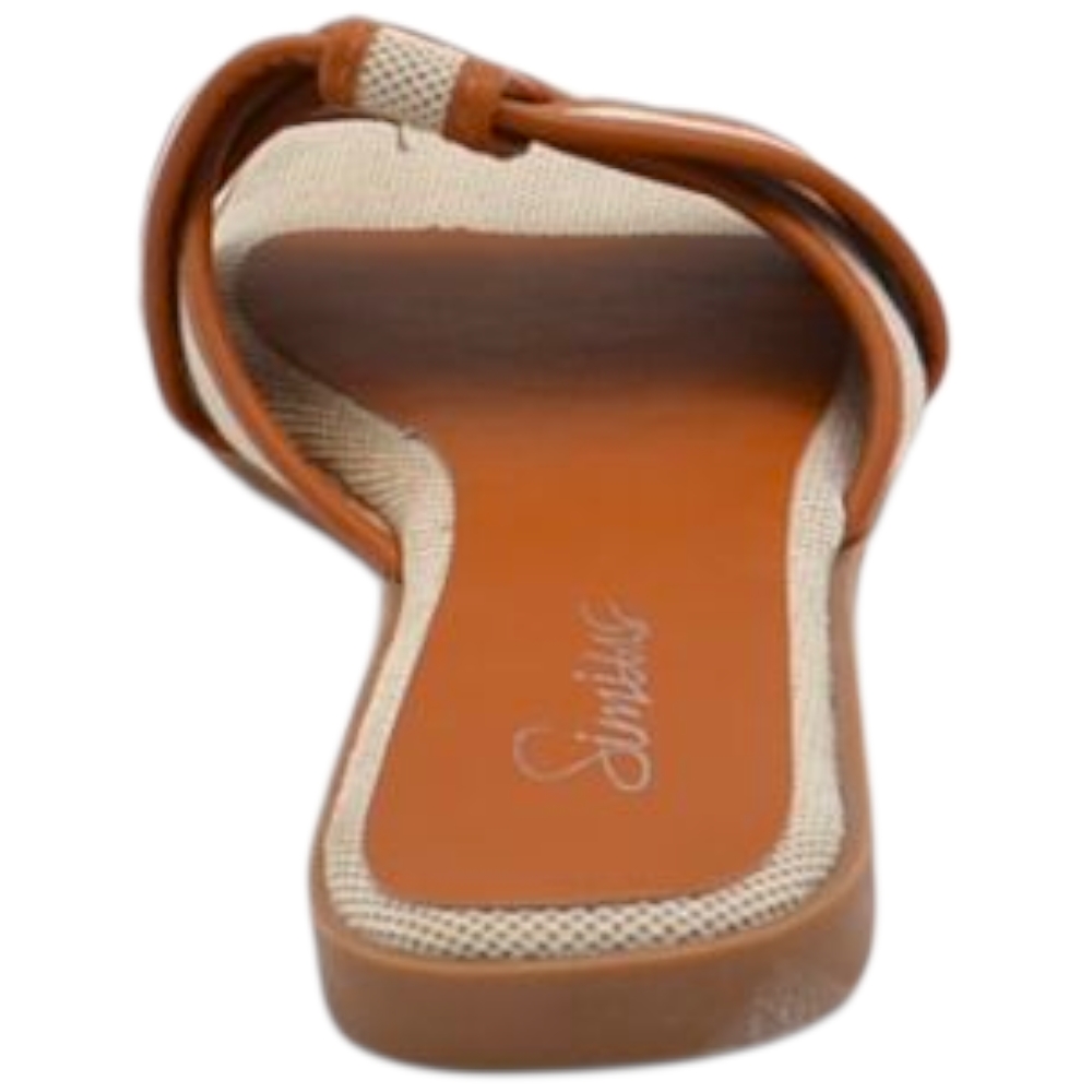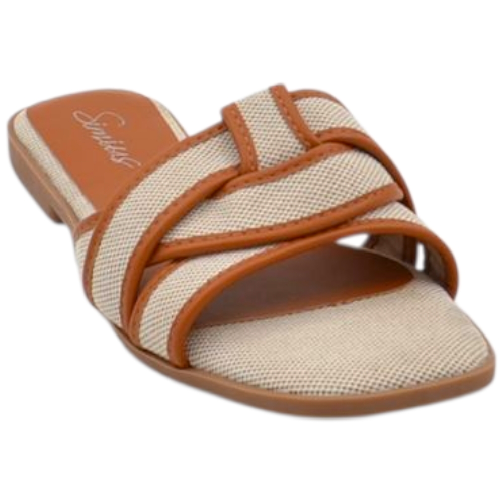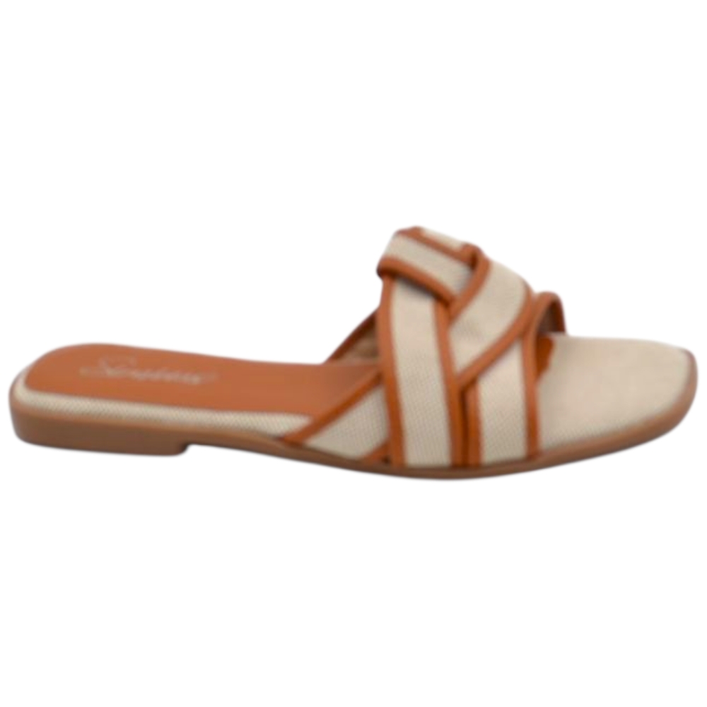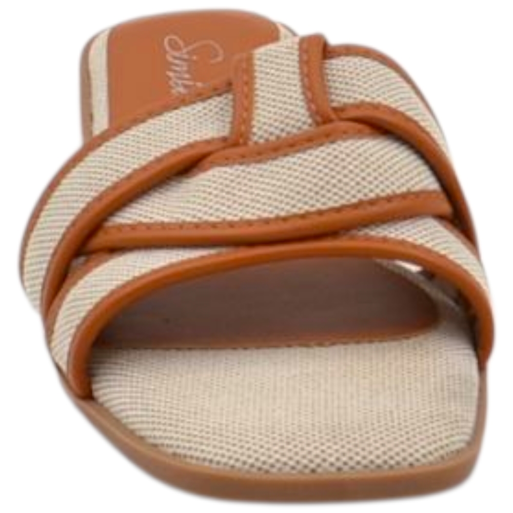 Pantofoline da donna basse basic in tela beige e cuoio con fasce incrociate e suola in memory