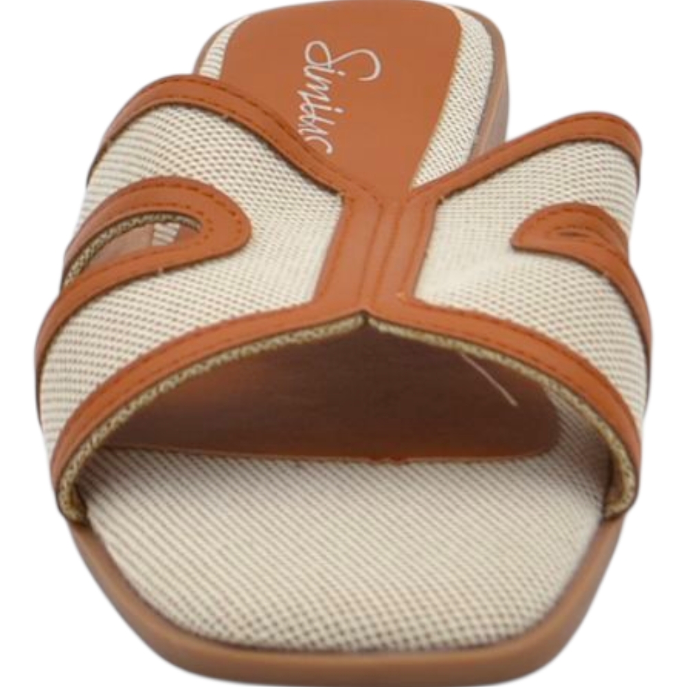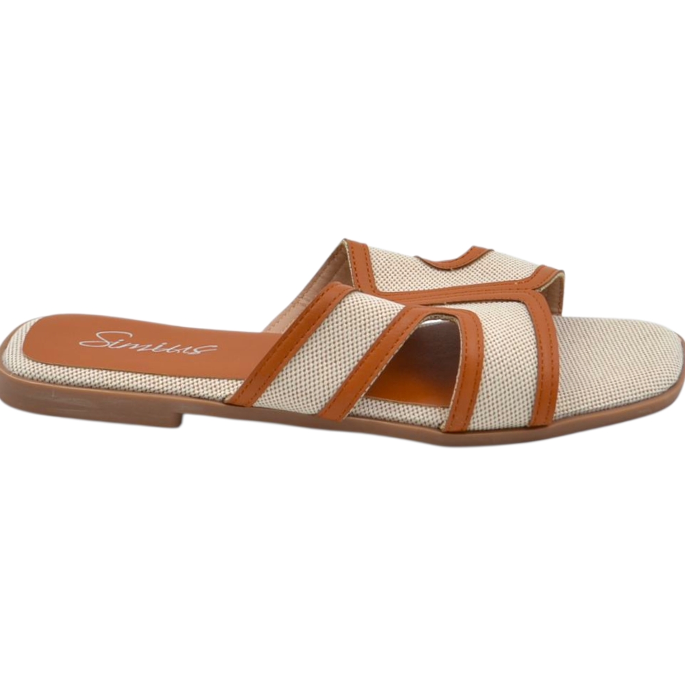 Pantofoline da donna basse basic in tela beige e cuoio con fasce incrociate e aperture laterali suola in memory