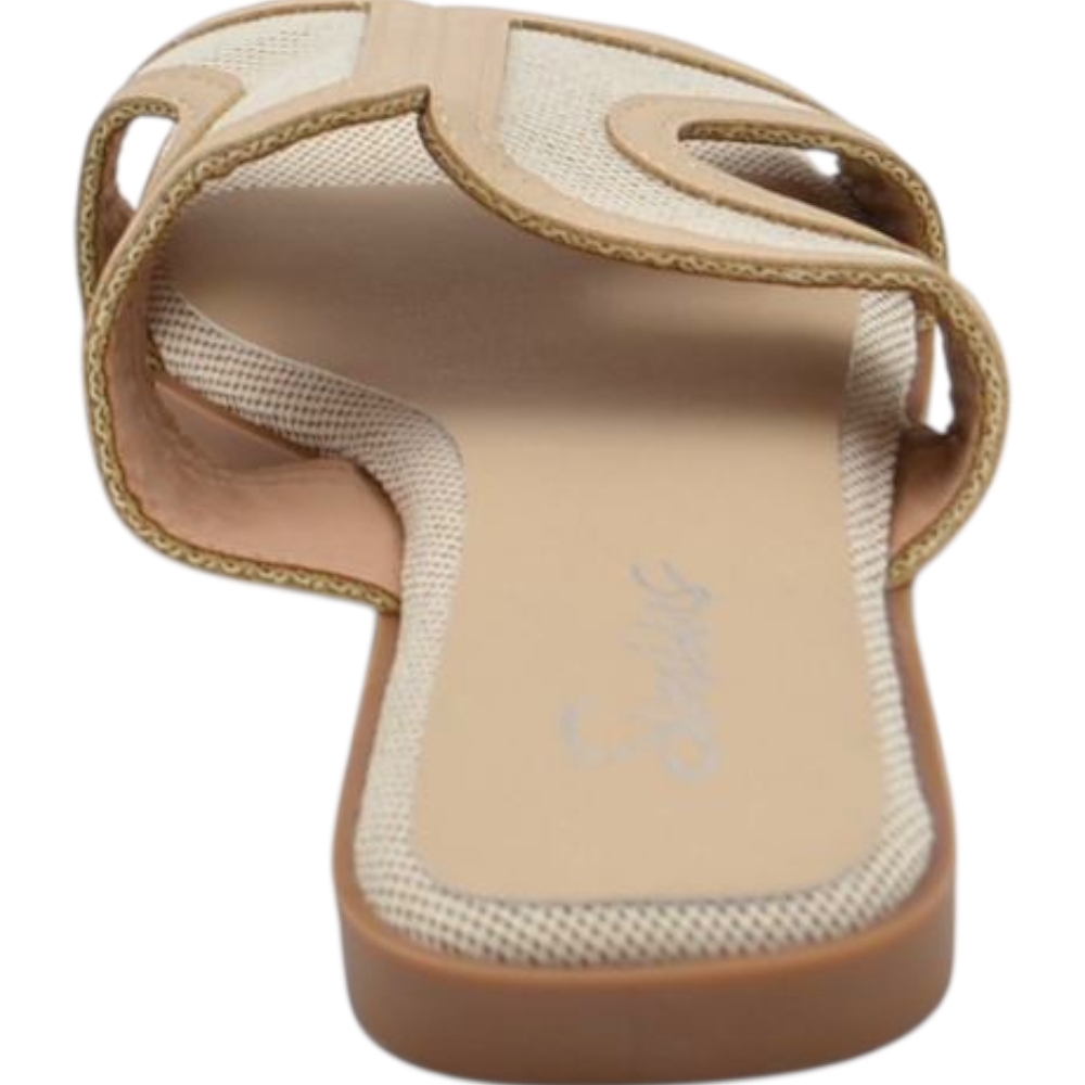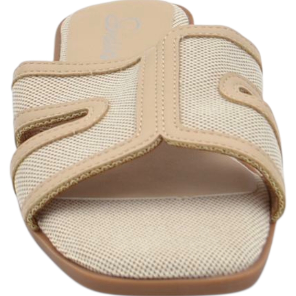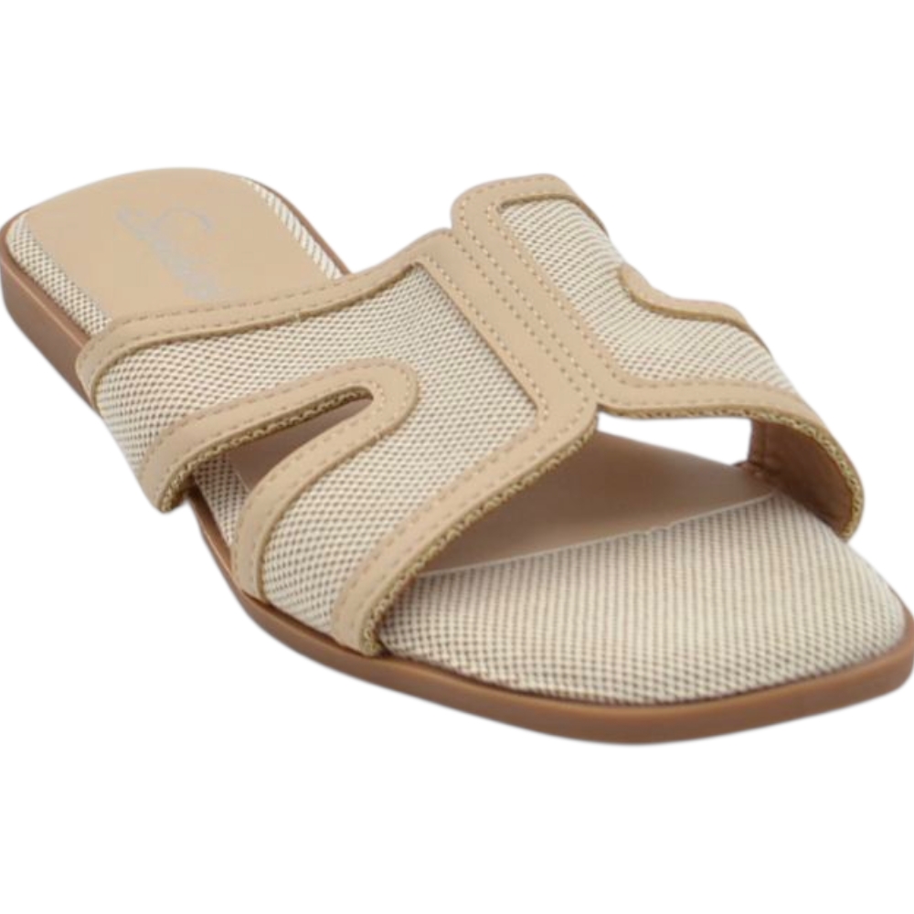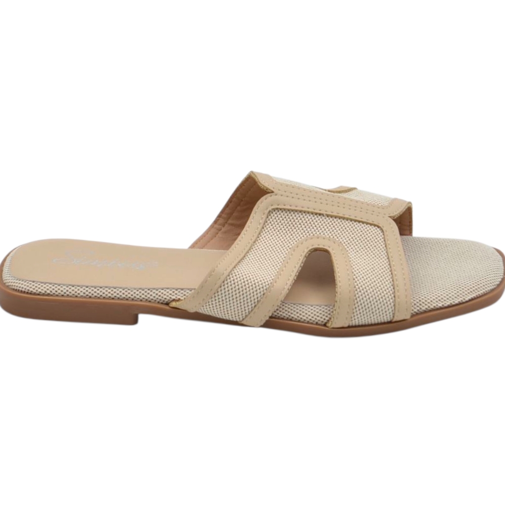 Pantofoline da donna basse basic in tela beige con fasce incrociate e aperture laterali suola in memory