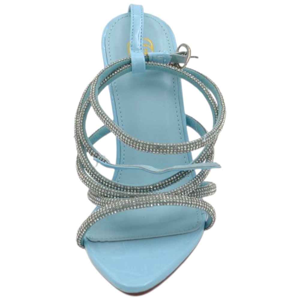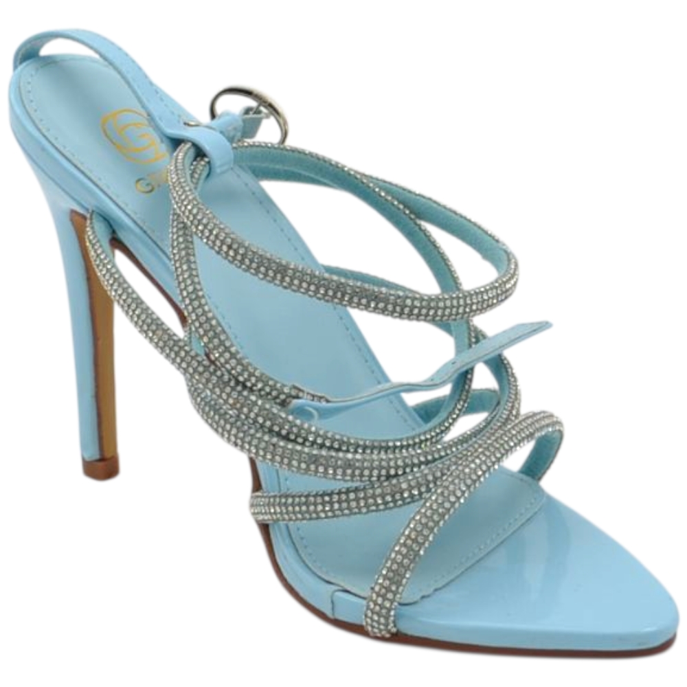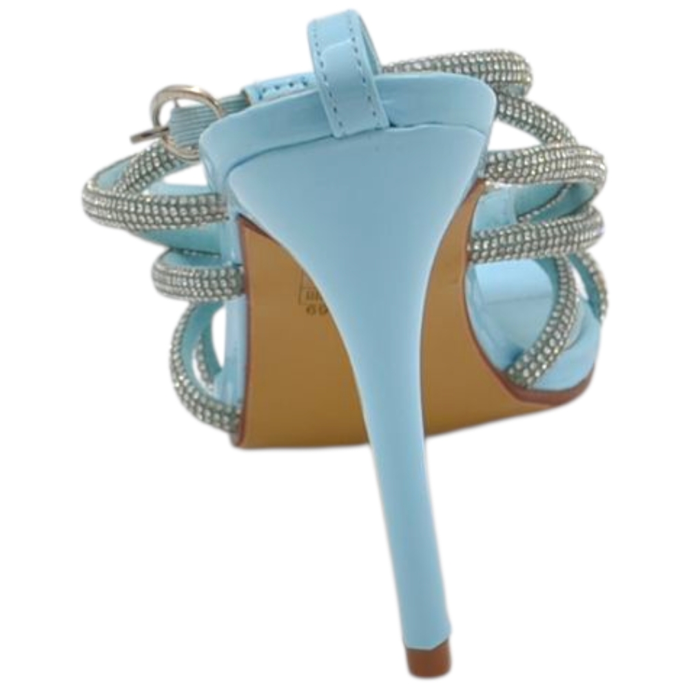 Sandalo gioiello azzurro donna tacco 12 fascia sottili incrociate con strass luccicanti cerimonia cinturino alla cavigli