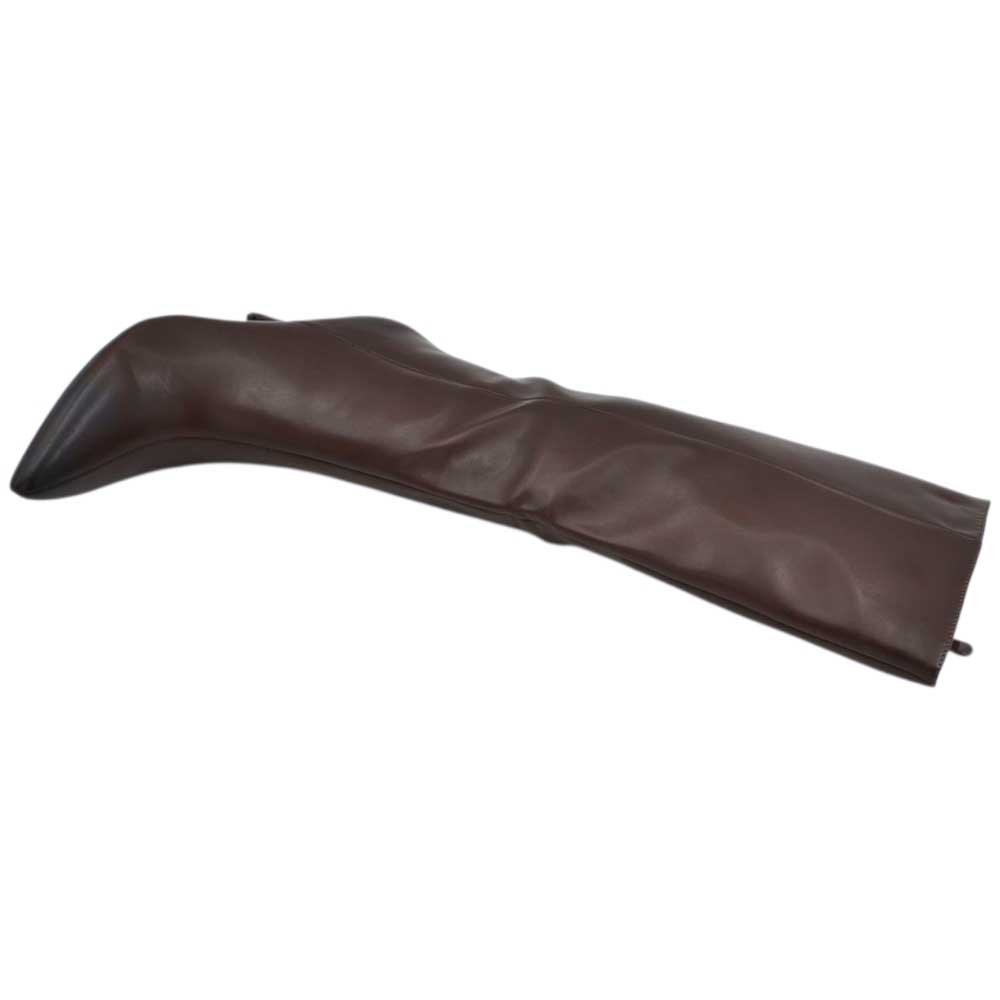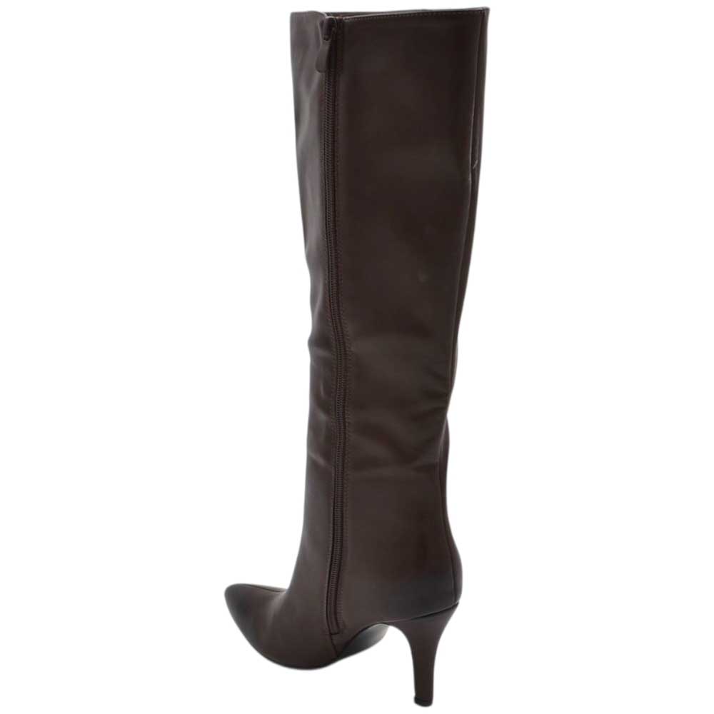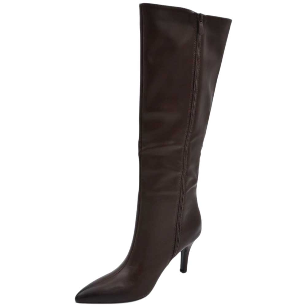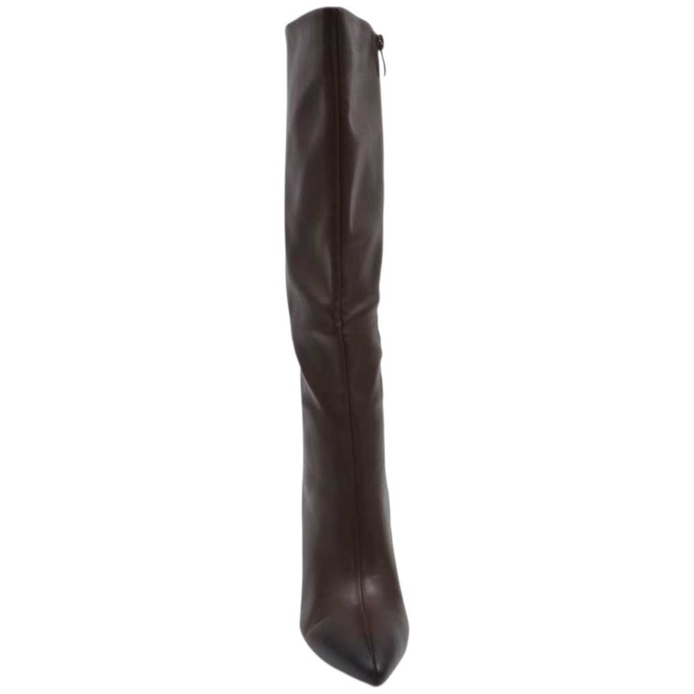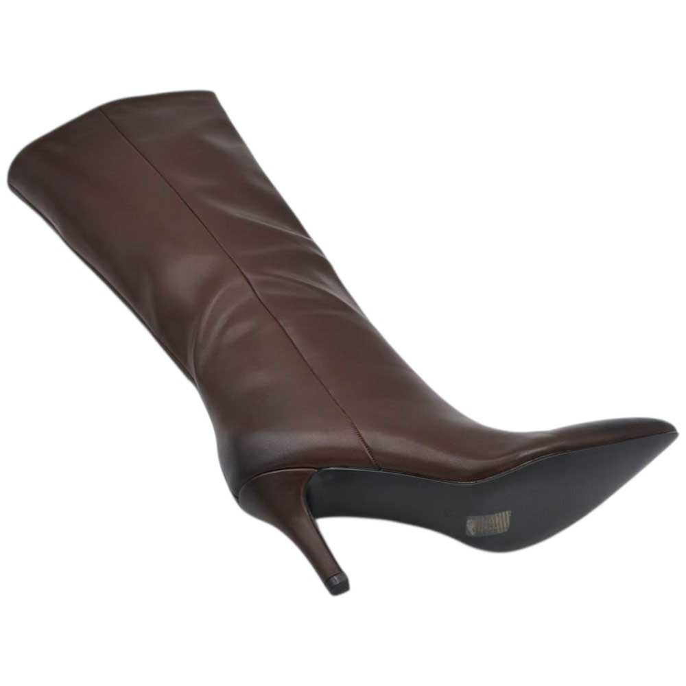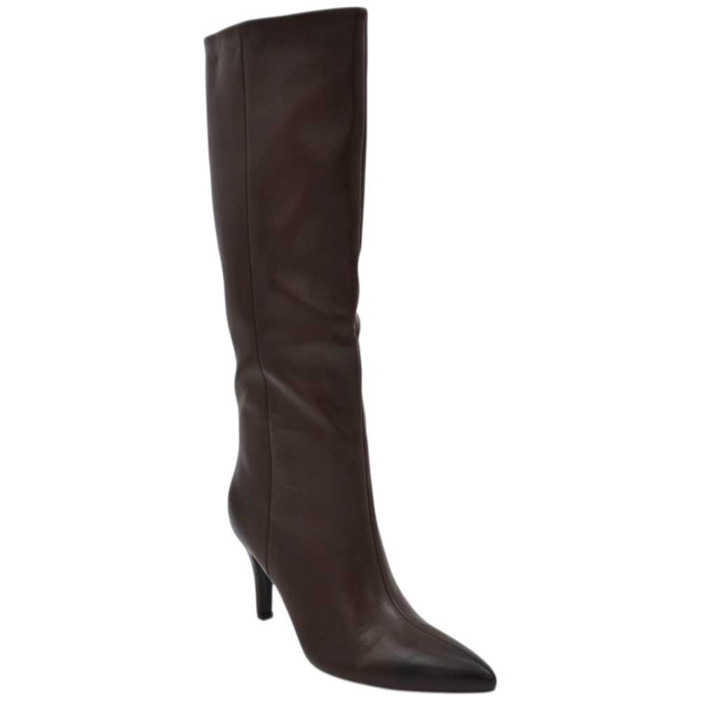 Stivali alti donna al ginocchio in pelle marrone a punta tacco a spillo 9 cm zip lunga aderente moda linea Basic