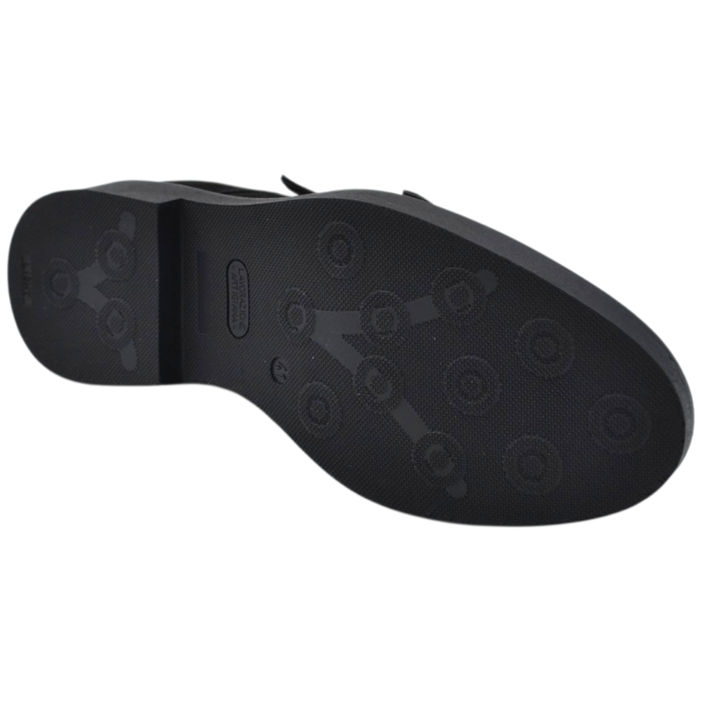 Scarpa uomo derby nero doppia fibbia argento in camoscio spazzolato cucitura in punta fondo gomma roccia alto handmade