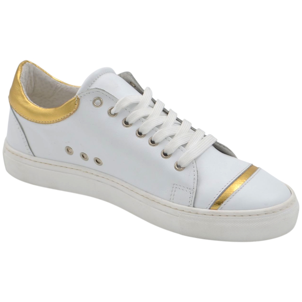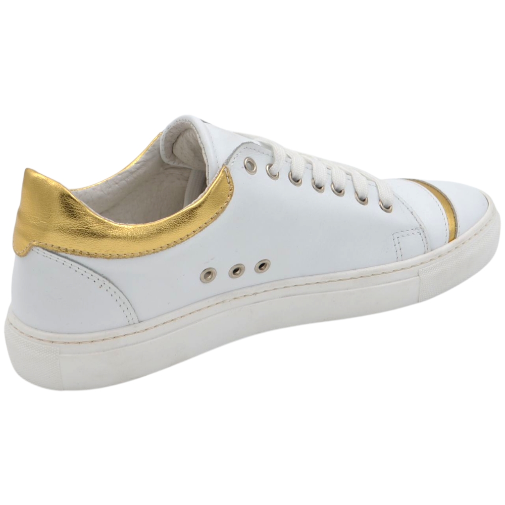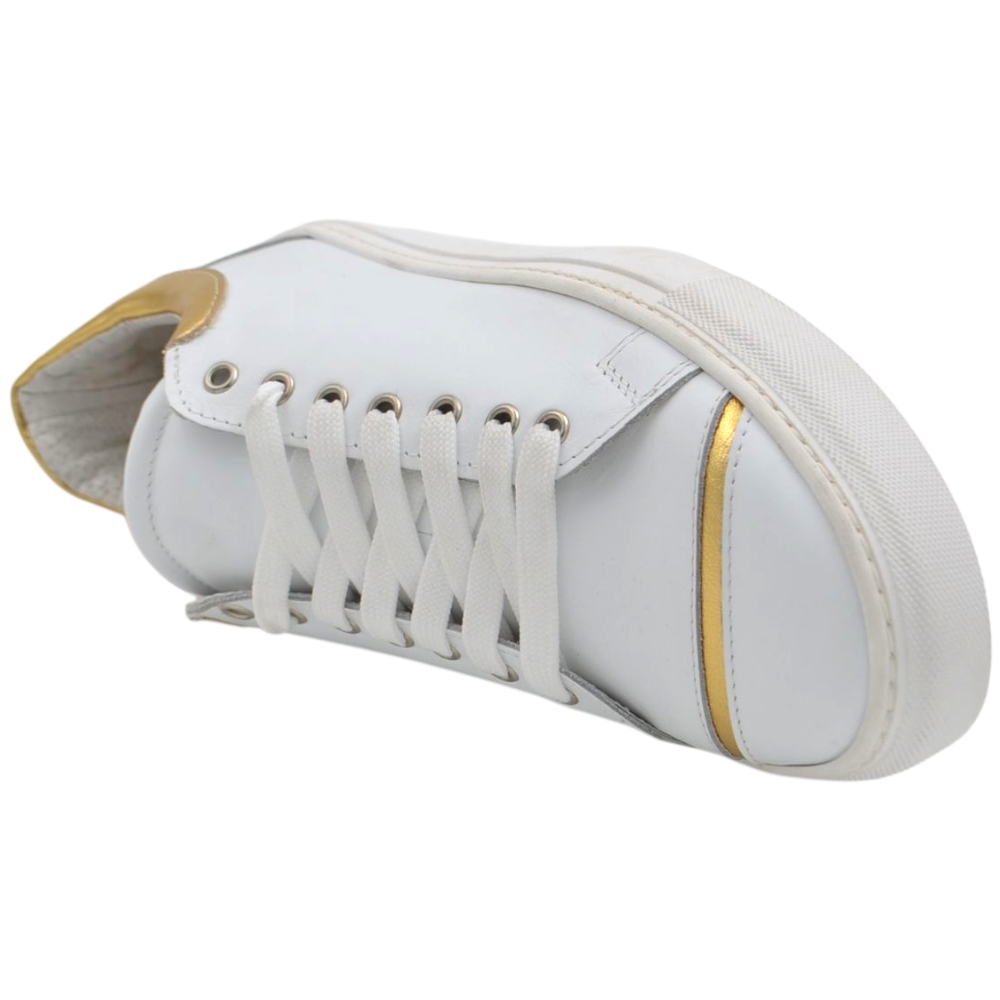 Sneakers uomo bassa in vera pelle vitello liscia bianca inserti oro con fondo in gomma eva lacci casual made in Italy